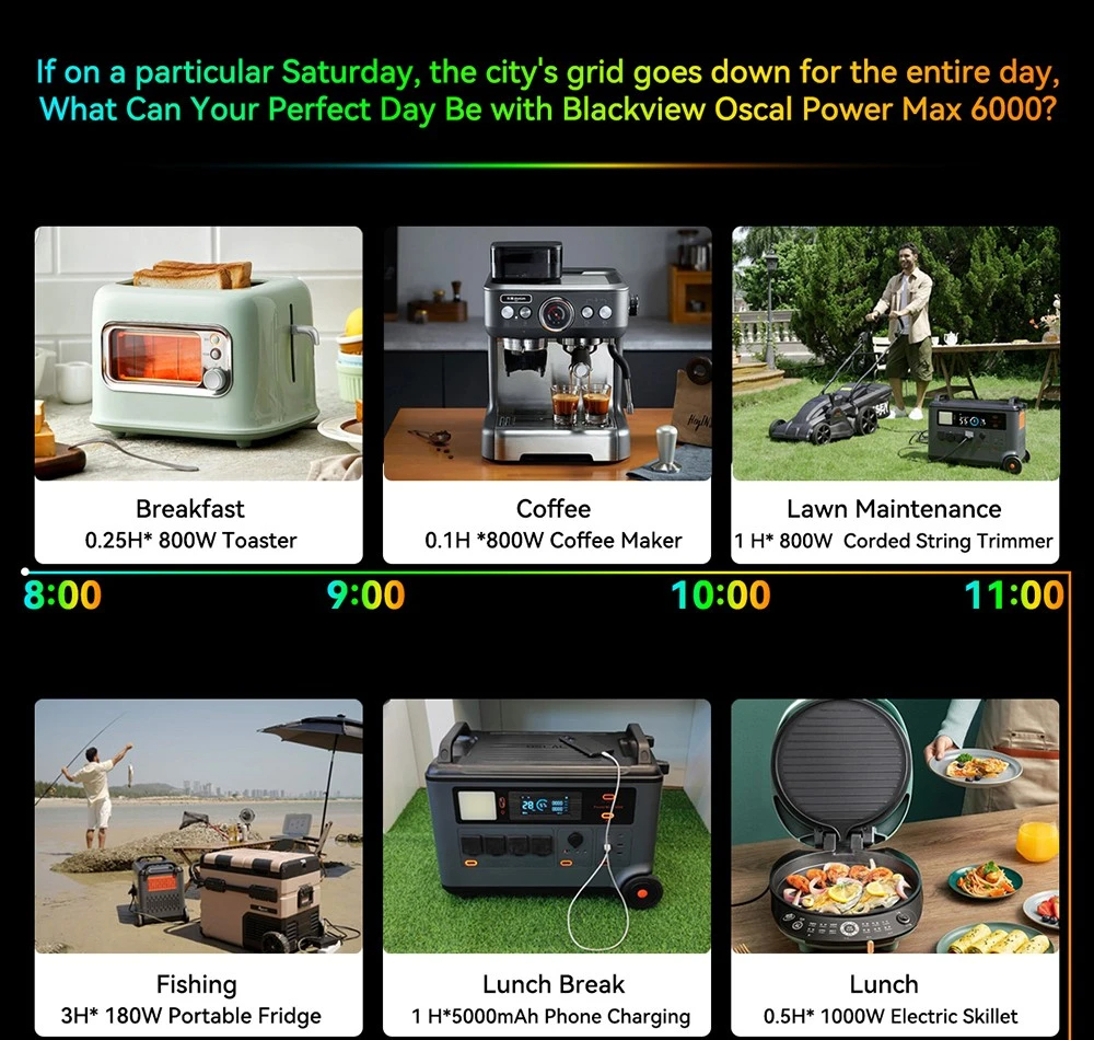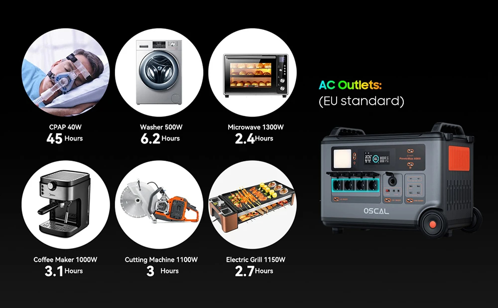 [6000W nimellisteho, jopa 99 % laitteista] 6000W puhdas siniaalto-lähtö takaa, että PowerMax 6000:aan liitetyt laitteet toimivat vakaasti. Teho riittää ammattilaiskäytön työkaluille off-grid-olosuhteissa, kuten porakoneille ja leikkauskoneille, sekä kodin peruslaitteille, kuten mikroaaltouunille, jääkaapille ja ilmastointilaitteelle.