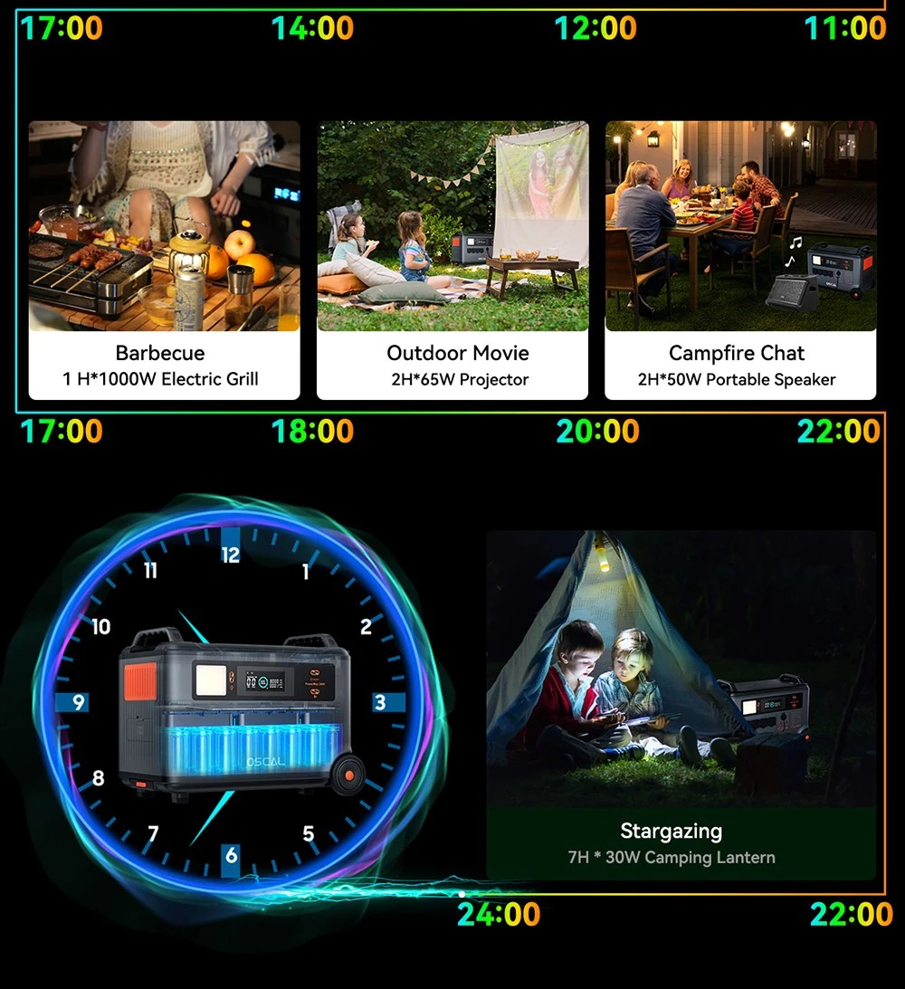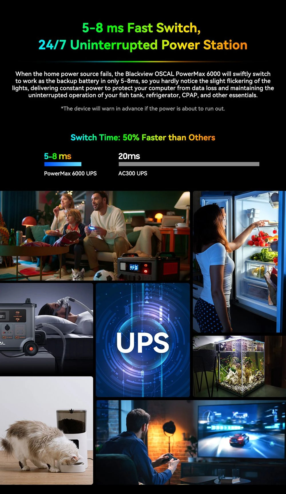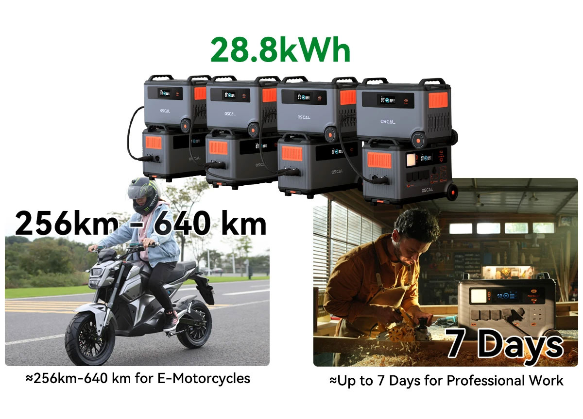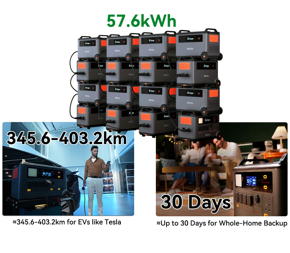 [57600Wh enimmäiskapasiteetti, jopa 30 päivän varavoima kotiin] Blackview OSCAL PowerMax 6000 on 100 % modulaarinen järjestelmä, jonka kapasiteettia voidaan laajentaa 3.6kWh:sta jopa 57.6kWh:iin lisäämällä jopa 15 akkupakettia (3600Wh per paketti). Näin se soveltuu sekä ulko- että sisäkäyttöön, lyhyistä retkistä pidempiin sähkökatkoihin.