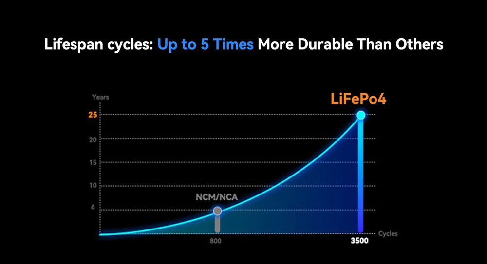 - LiFePO4-akku, yli 3500 lataussykliä 80 %:iin alkuperäisestä kapasiteetista
