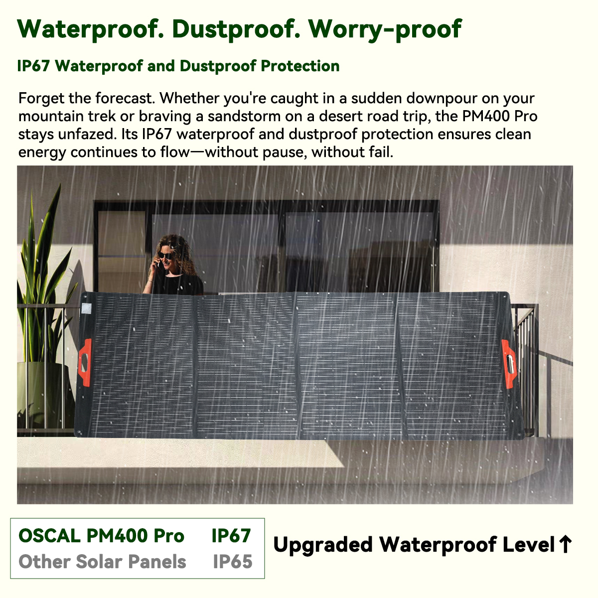 [Parannettu ETFE-suojakerros] Parannettu ETFE-suojakerros ja korkealaatuinen ulkopinta tekevät OSCAL PM200 PRO / PM400 PRO -aurinkopaneelista vedenkestävän, pitkäikäisen ja kulutusta kestävän.