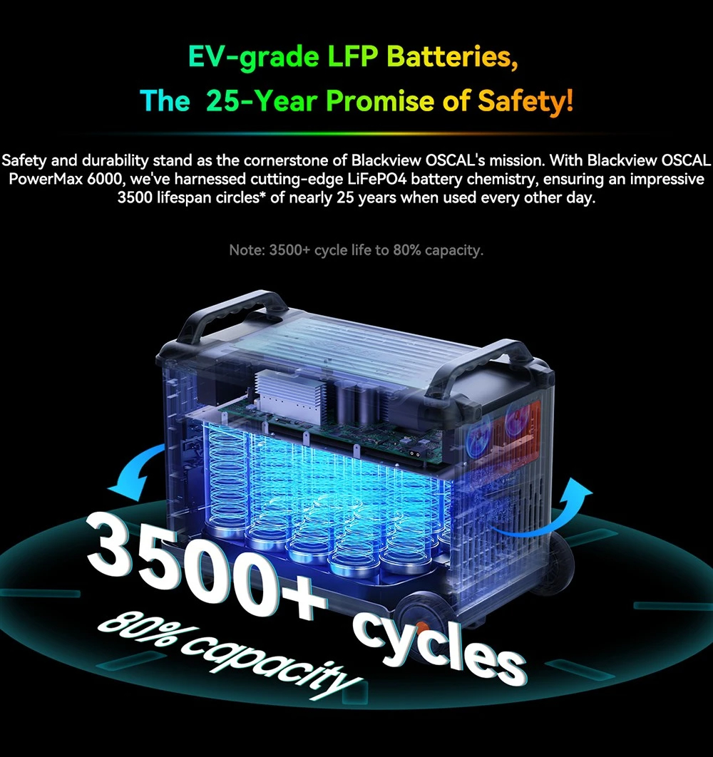 Blackview OSCAL PowerMax 6000 Portable Power Station on kestävä ja tehokas varavirtajärjestelmä kotiin, mökille ja vaativaan ulkokäyttöön. Järjestelmä tarjoaa jopa 6000W puhdasta siniaaltoa, useita liitäntöjä eri laitteille ja pitkäikäisen LiFePO4-akun. Modulaarisen rakenteen ansiosta kapasiteettia voidaan laajentaa jopa 57600Wh asti lisäakkujen avulla.