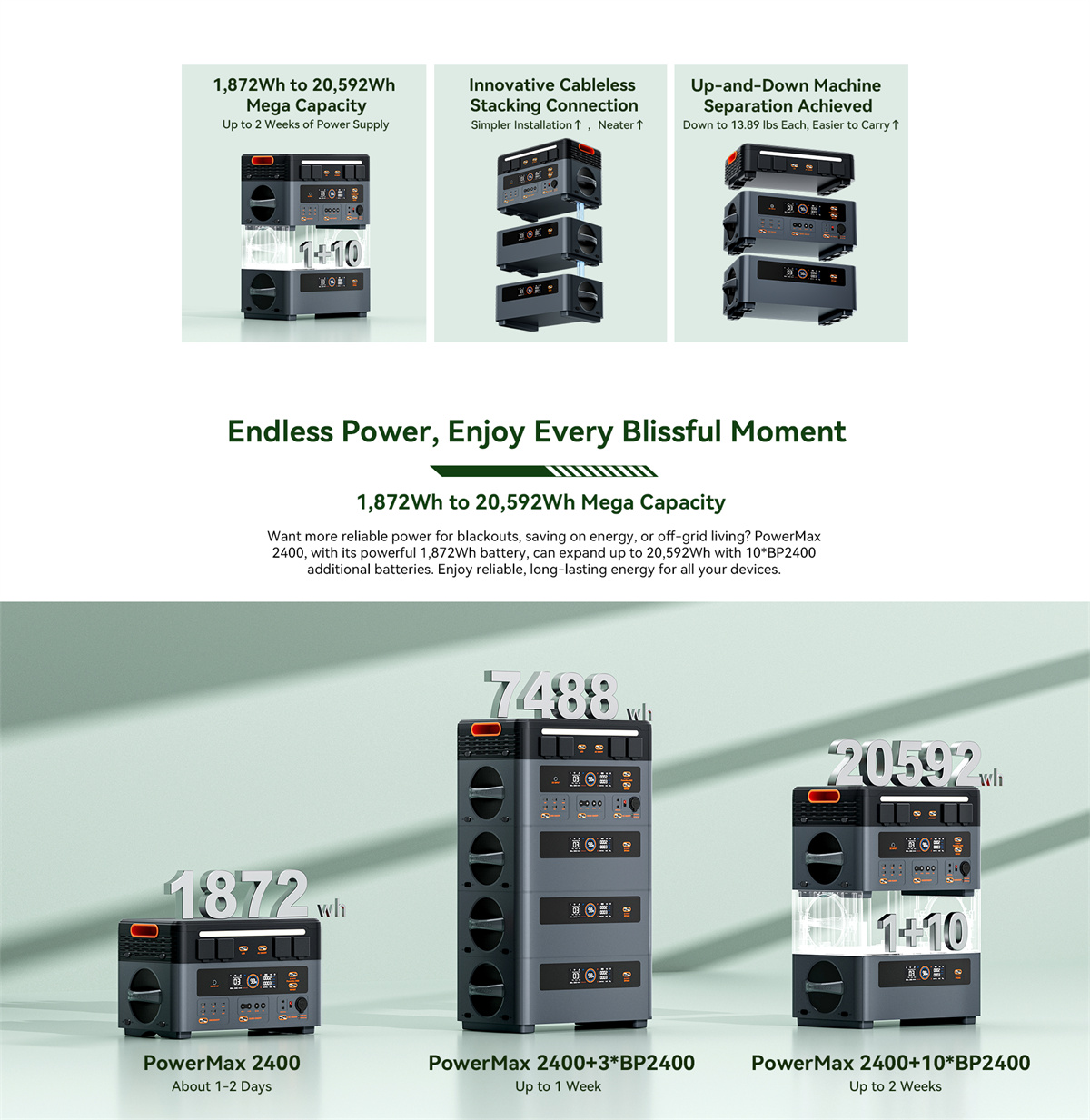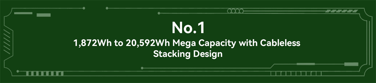 2. 20592Wh maksimiakku: 100 % modulaarinen rakenne, laajennus 1,872Wh–20,592Wh jopa 10 akkupakalla (2400Wh/pakkaus).