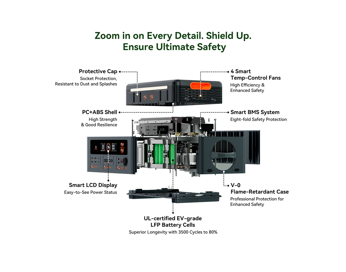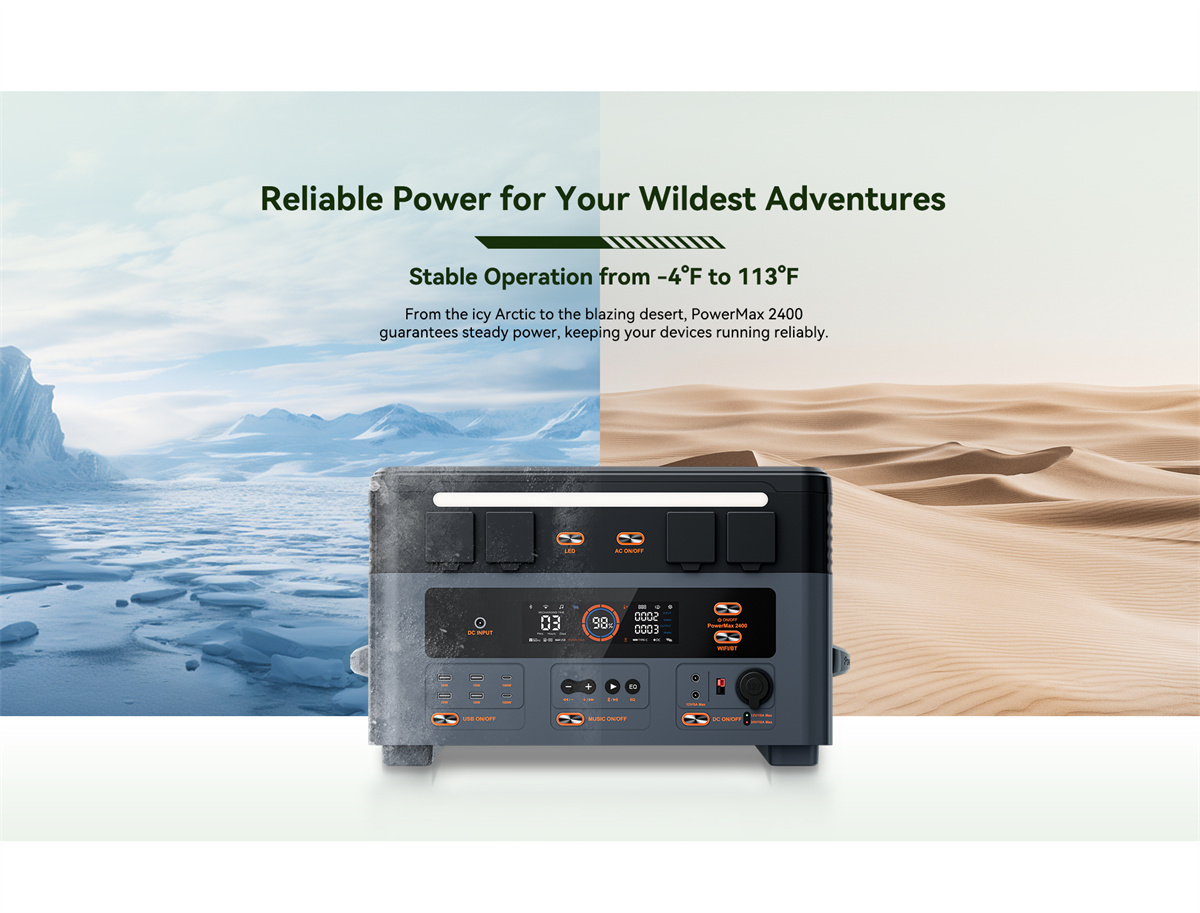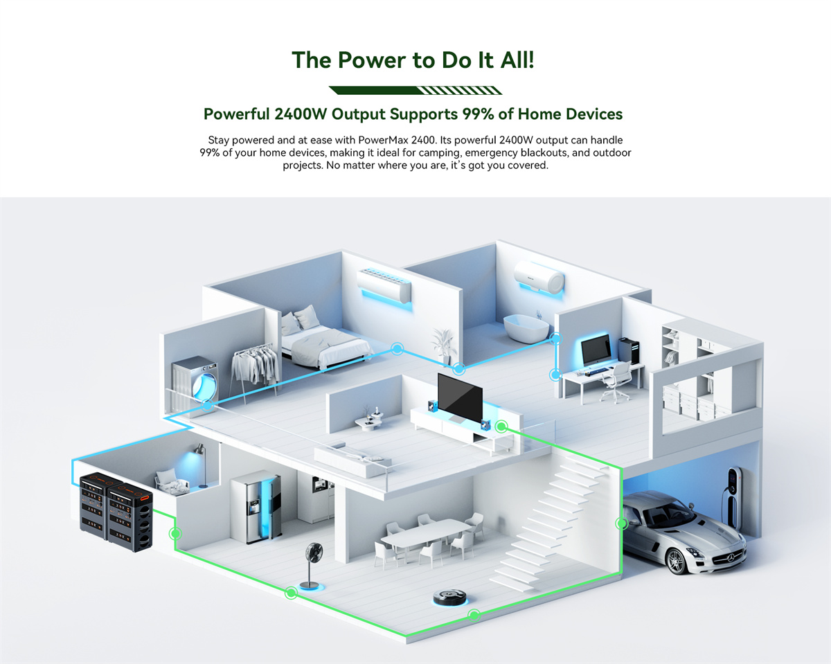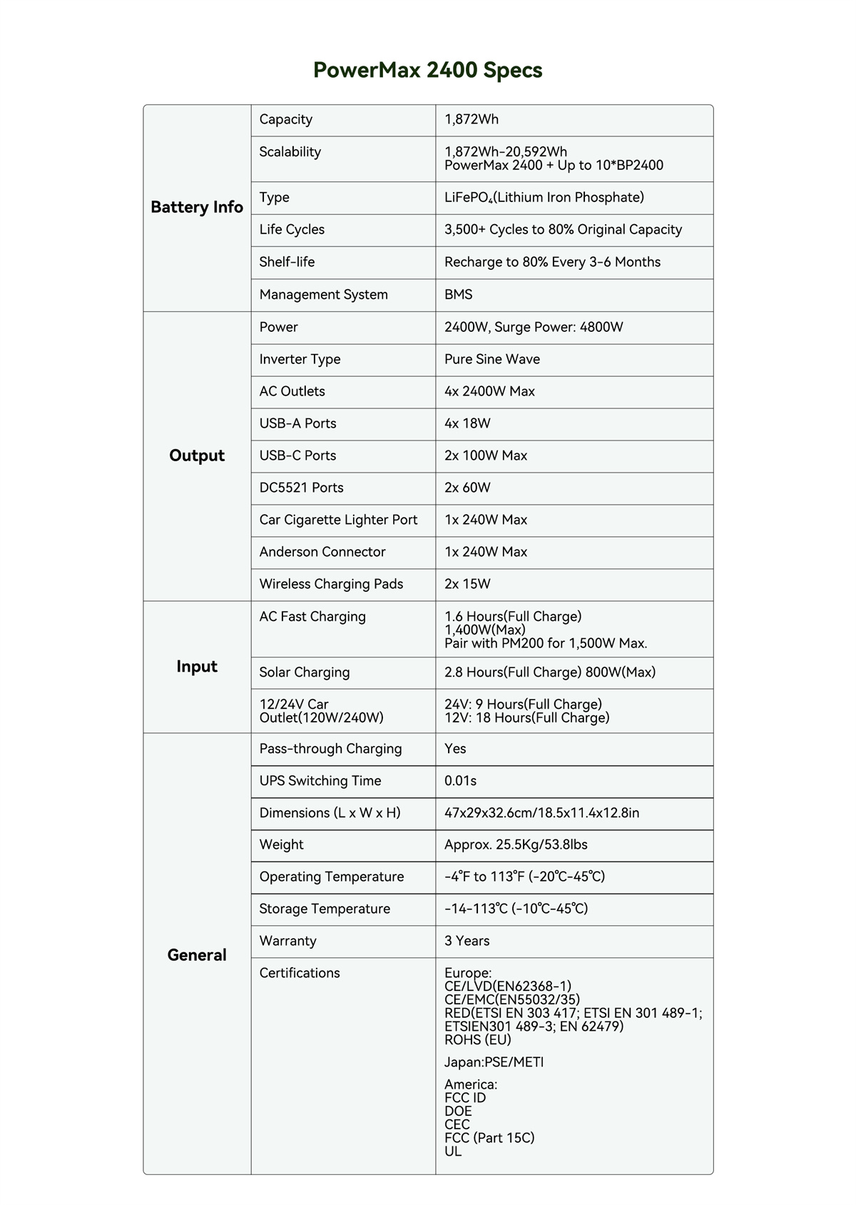 | Akun tiedot | Kapasiteetti: 1,872Wh Laajennettavuus: 1,872Wh~20,592Wh (PowerMax 2400 + enintään 10*BP2400) Tyyppi: LiFePO₄ (litiumrautafosfaatti) Elinkaari: 3,500+ sykliä 80 % alkuperäisestä kapasiteetista Säilytysaika: lataa 80 %:iin 3–6 kuukauden välein Akun hallintajärjestelmä: BMS |