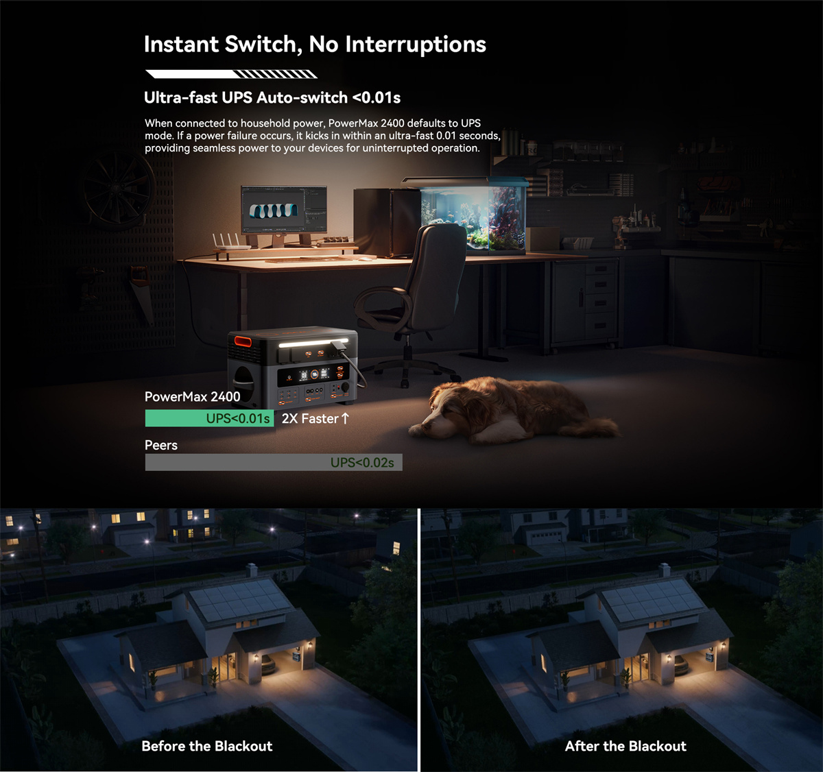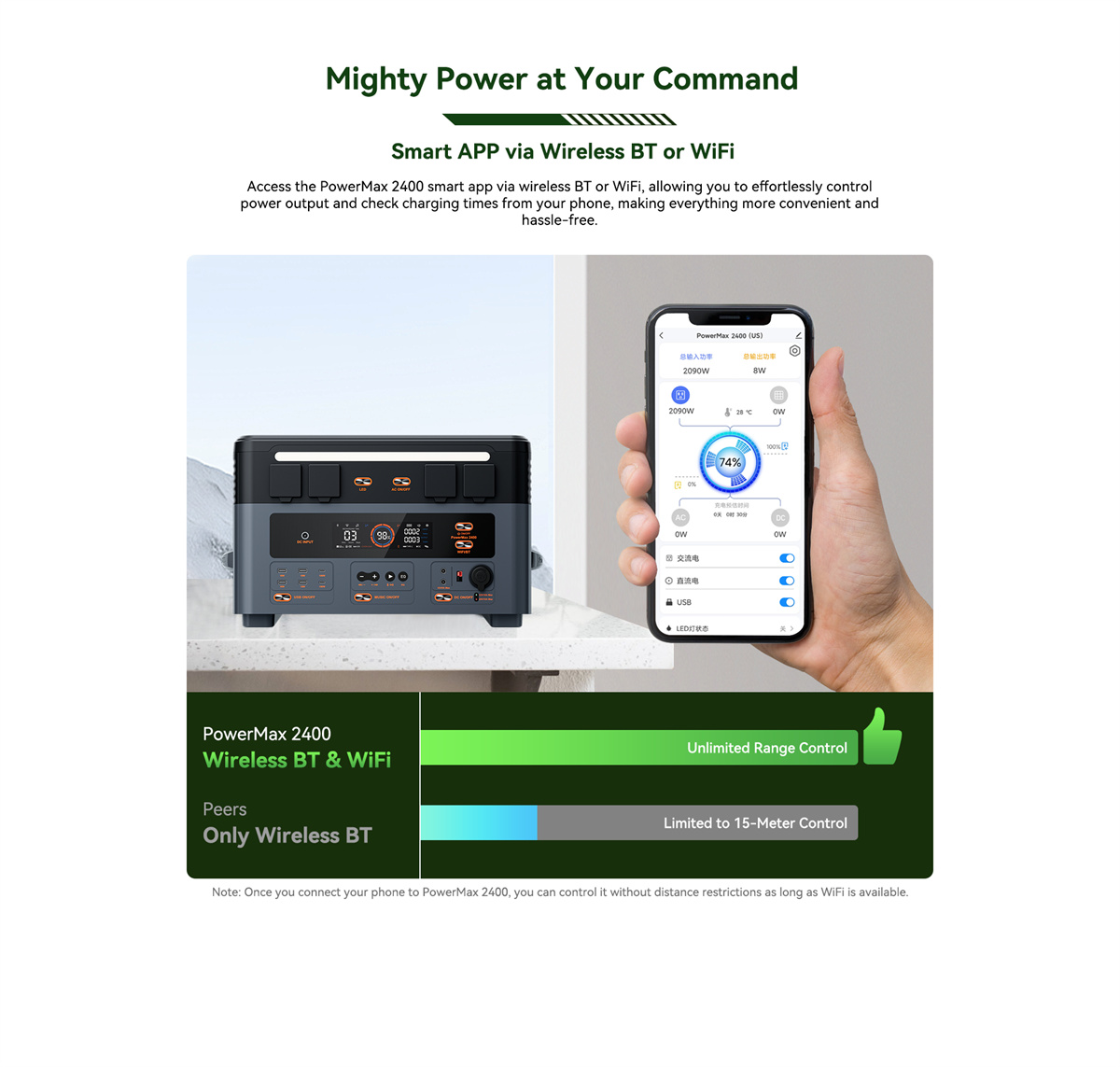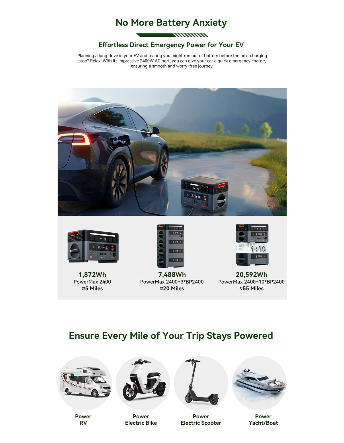 | Akun tiedot | Kapasiteetti: 1,872Wh Laajennettavuus: 1,872Wh~20,592Wh (PowerMax 2400 + enintään 10*BP2400) Tyyppi: LiFePO₄ (litiumrautafosfaatti) Elinkaari: 3,500+ sykliä 80 % alkuperäisestä kapasiteetista Säilytysaika: lataa 80 %:iin 3–6 kuukauden välein Akun hallintajärjestelmä: BMS |