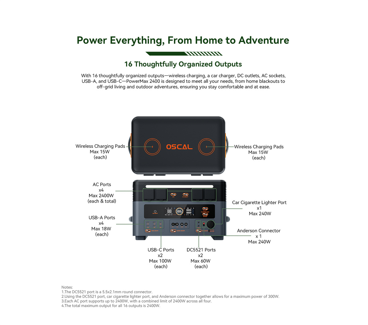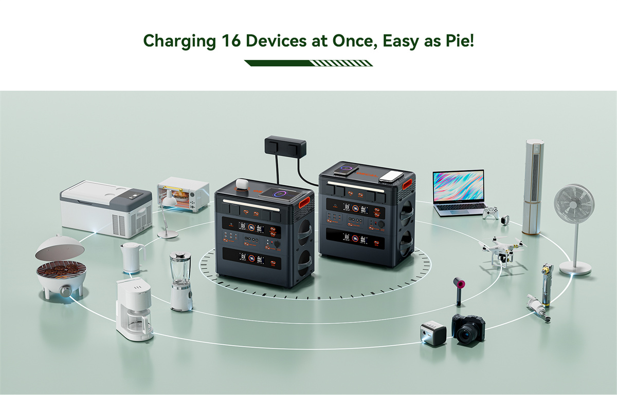 1. 16 harkitusti järjestettyä lähtöä: 2400W puhdas siniaaltoinvertteri ja 16 lähtöä kattavat useimmat käyttötarpeet kotona ja ulkona.