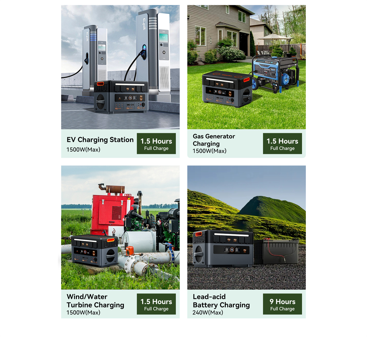 | Sisääntulo | AC-pikalataus: 1.6 tuntia (täyteen) 1400W (maks.) Yhdistettynä PM200:aan 1500W maks. Aurinkolataus: 2.8 tuntia (täyteen) 800W (maks.) 12/24V auton pistorasia (120W/240W): 24V: 9 tuntia (täyteen) 12V: 18 tuntia (täyteen) |