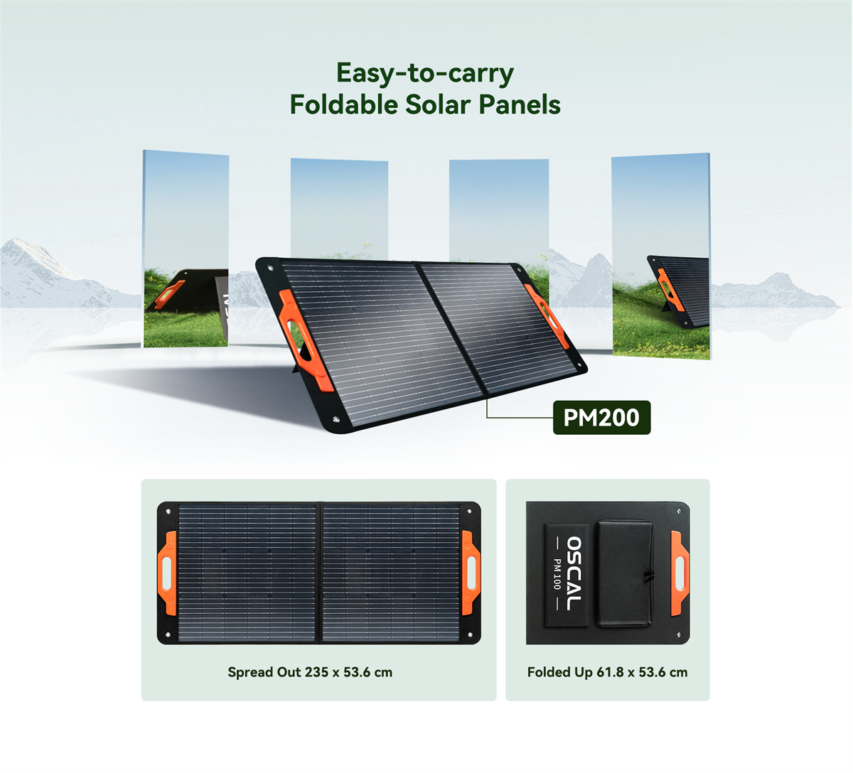 | PM200 -aurinkopaneeli | Maksimiteho (Ppm): 200W±5% Maksimivirta (Im): 9.52A±5% Maksimijännite (Vm): 21V±5% Avoimen piirin jännite: 25.2V±5% Oikosulkuvirta: 11.42A±5% Kennojen laminaatti: ETFE Kennotyyppi: monokiteinen pii Muunnostehokkuus: ≥21.7% Käyttölämpötila: -10–+65℃ Paino: 7kg±1kg Mitat (avattuna): 2349*536*25mm Mitat (taitettuna): 536*618*54mm |