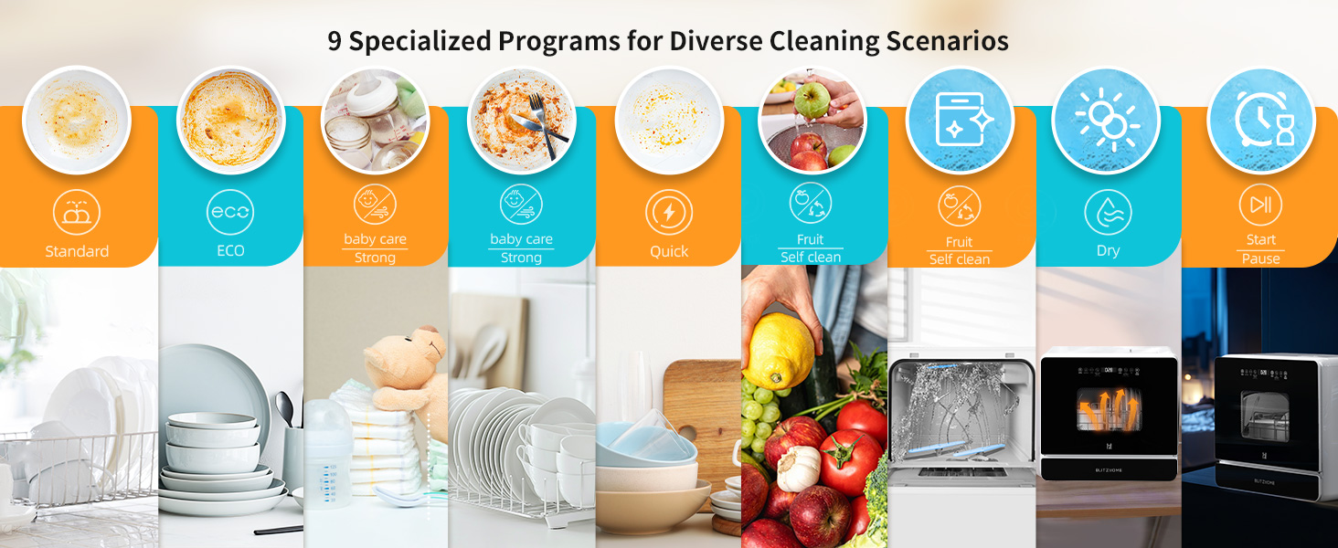 - 9 pesuohjelmaa monipuoliseen käyttöön: Vakio, ECO-tila, Tehokas, Vauvanhoito, Pika, Hedelmä, Itsepuhdistus, Kuivaus, Aloituksen viive.