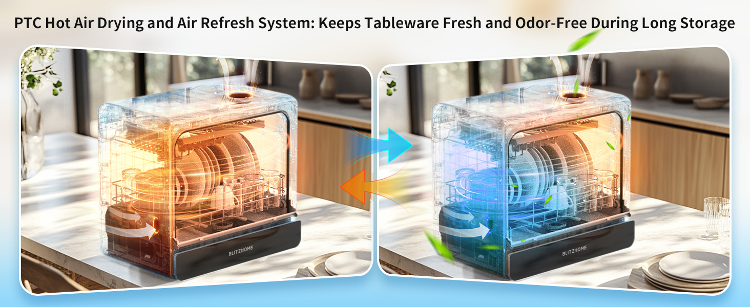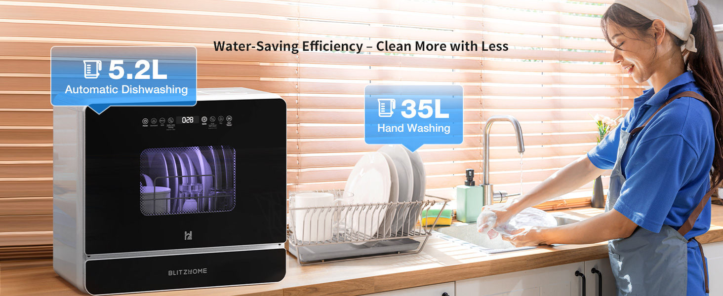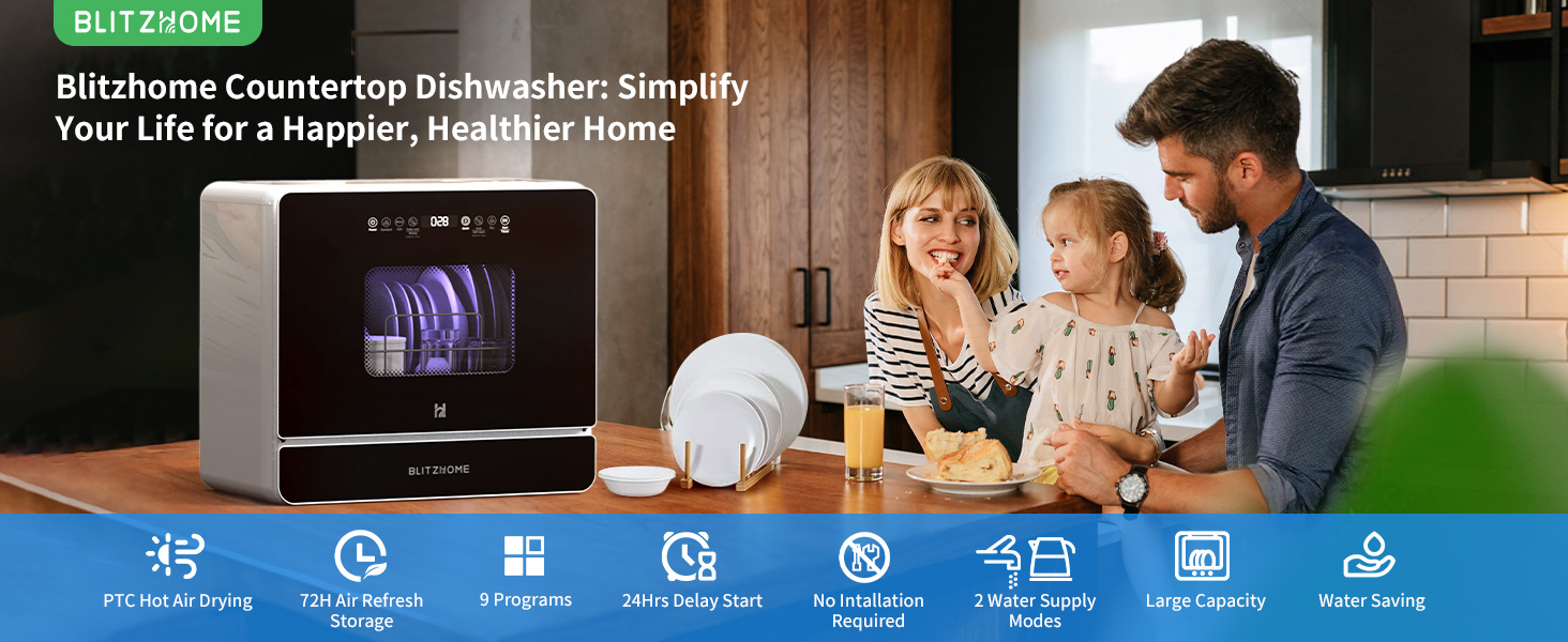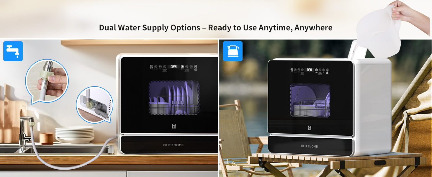 Tämä pöytämallinen BlitzHome -astianpesukone on helppo ottaa käyttöön ilman kiinteää asennusta. Valitse sisäinen 5.2L säiliö liikuteltavaan käyttöön tai kytke suoraan hanaan. Korkealämpöinen pesu ja PTC-kuivatus huolehtivat hygieniasta, ja 72 tunnin ilmanvaihto auttaa pitämään astiat kuivina ja raikkaina myös säilytyksen aikana.