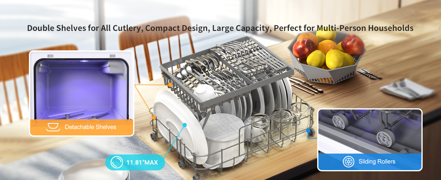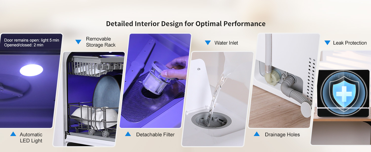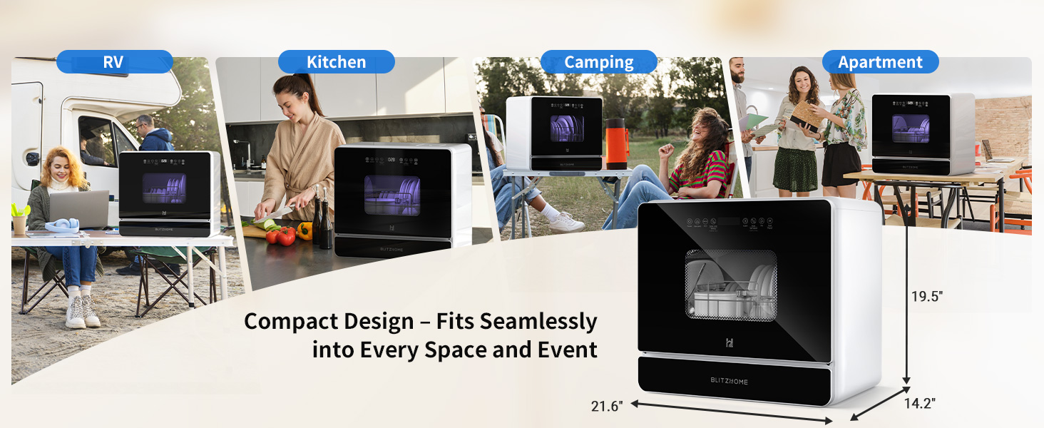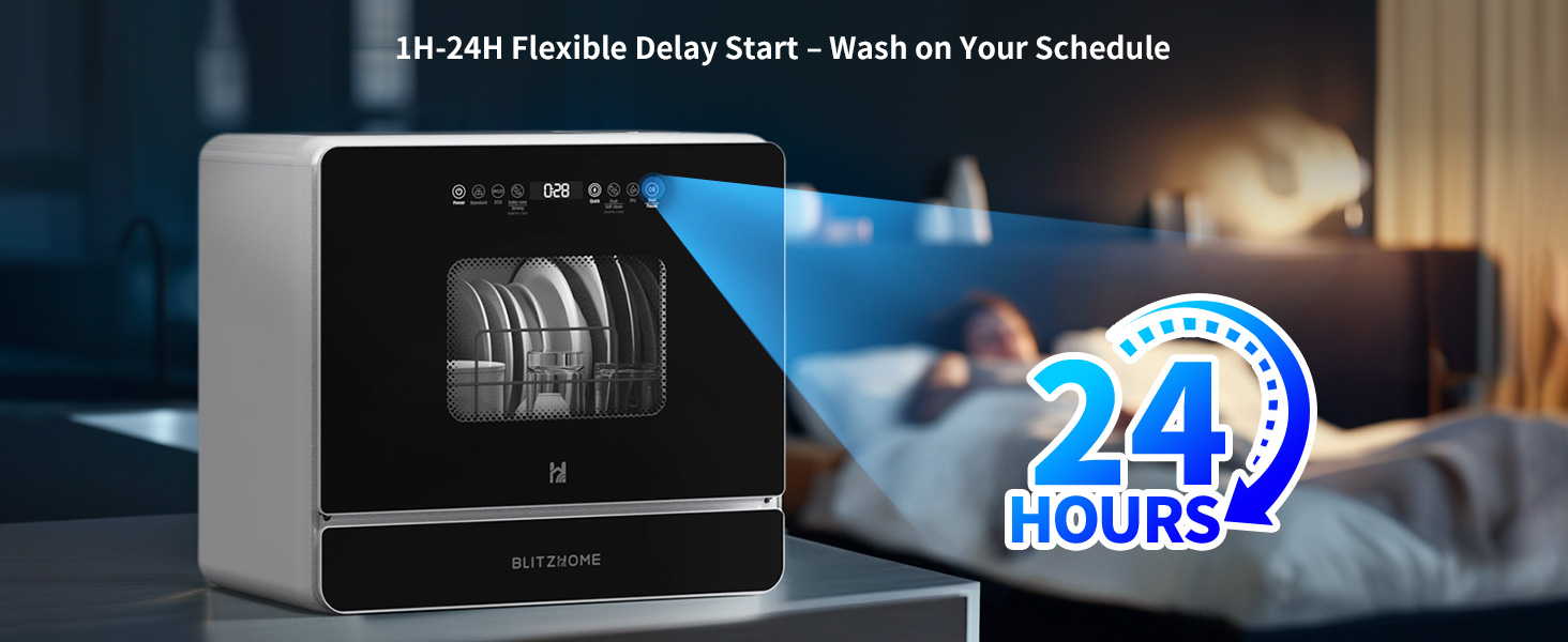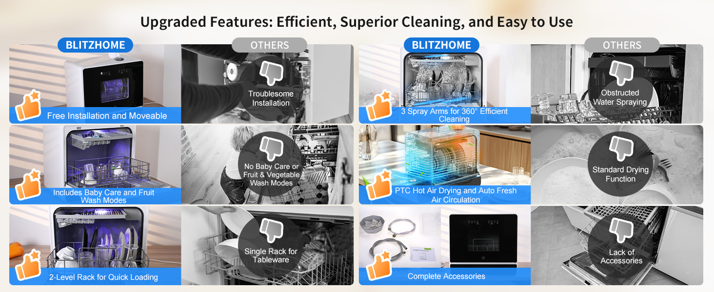 Tämä pöytämallinen BlitzHome -astianpesukone on helppo ottaa käyttöön ilman kiinteää asennusta. Valitse sisäinen 5.2L säiliö liikuteltavaan käyttöön tai kytke suoraan hanaan. Korkealämpöinen pesu ja PTC-kuivatus huolehtivat hygieniasta, ja 72 tunnin ilmanvaihto auttaa pitämään astiat kuivina ja raikkaina myös säilytyksen aikana.