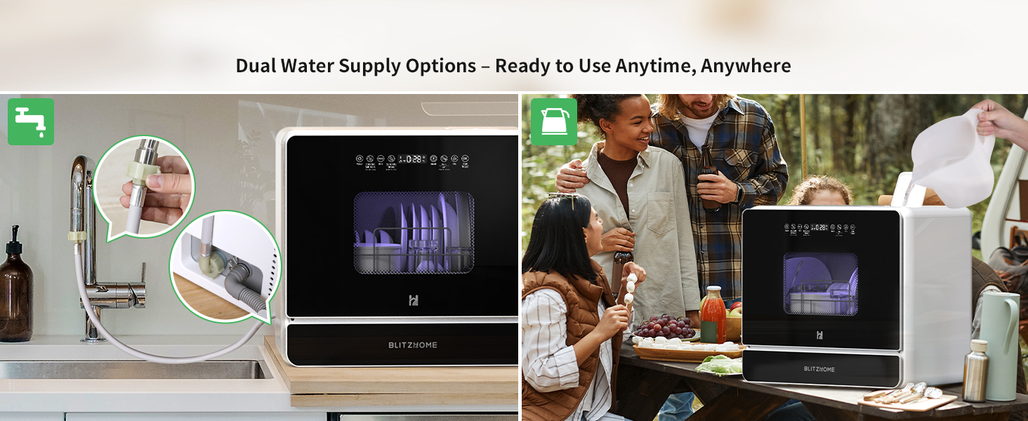 Kaksoissyöttö vedelle – ei asennusta: Täytä 5.2L sisäinen säiliö tai liitä suoraan hanaan. Sopii keittiöihin, pieniin asuntoihin, asuntoloihin ja matkailuautoihin – ilman monimutkaista asennusta.