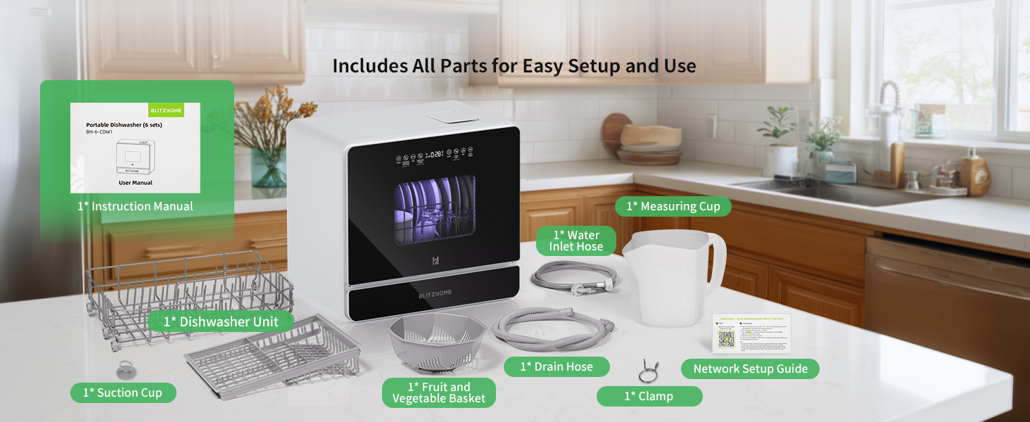 1 x astianpesukonelaite 1 x hedelmä- ja vihanneskori 1 x mittakuppi 1 x poistoletku 1 x tulovesiletku 1 x kiristin 1 x imukuppi 1 x käyttöohje |
