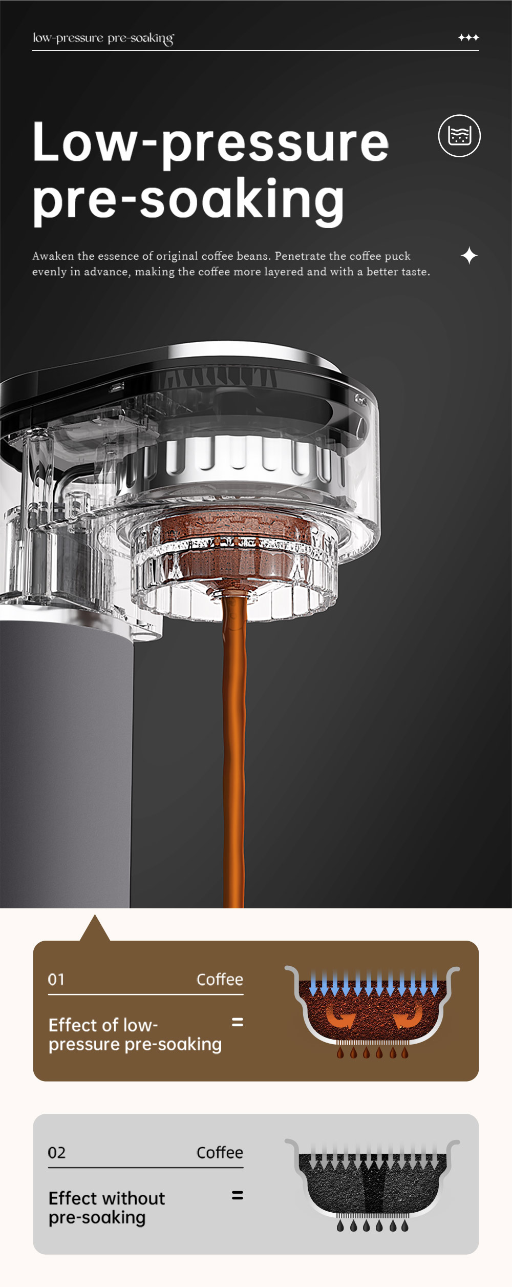 - Kaksi uuttotilaa: valitse kuuma tai kylmä uutto. Kuumauuton veden lämpötila on säädettävissä välillä 85°C–95°C täyteläistä makua varten, kylmäuutto valmistuu tasaisesti 33°C:ssa.
