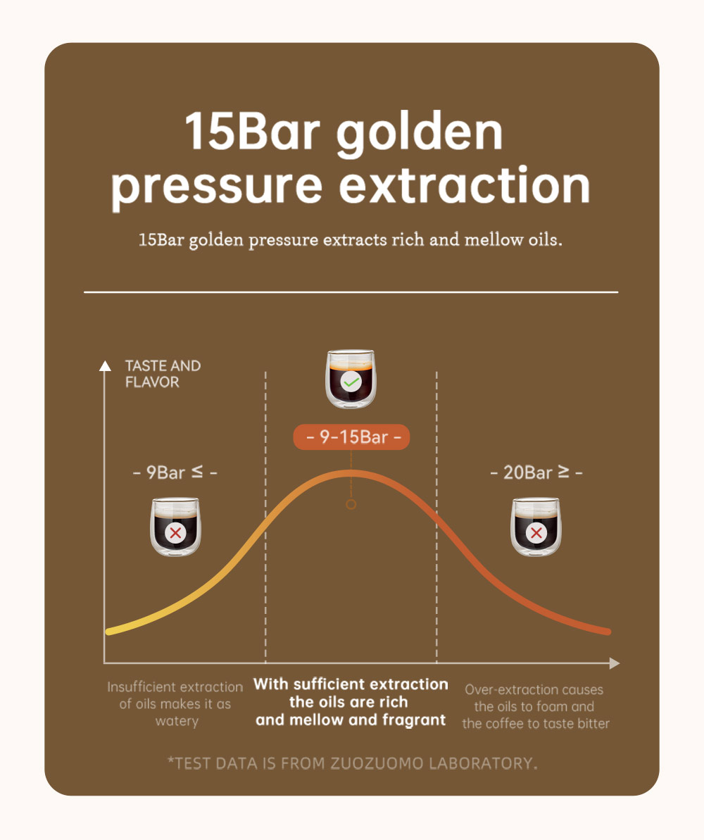 - 15 bar paine ja esiuutto: voimakas 15 barin paine yhdistettynä matalapaineiseen esiuuttoon auttaa irrottamaan parhaat aromit kahvista.