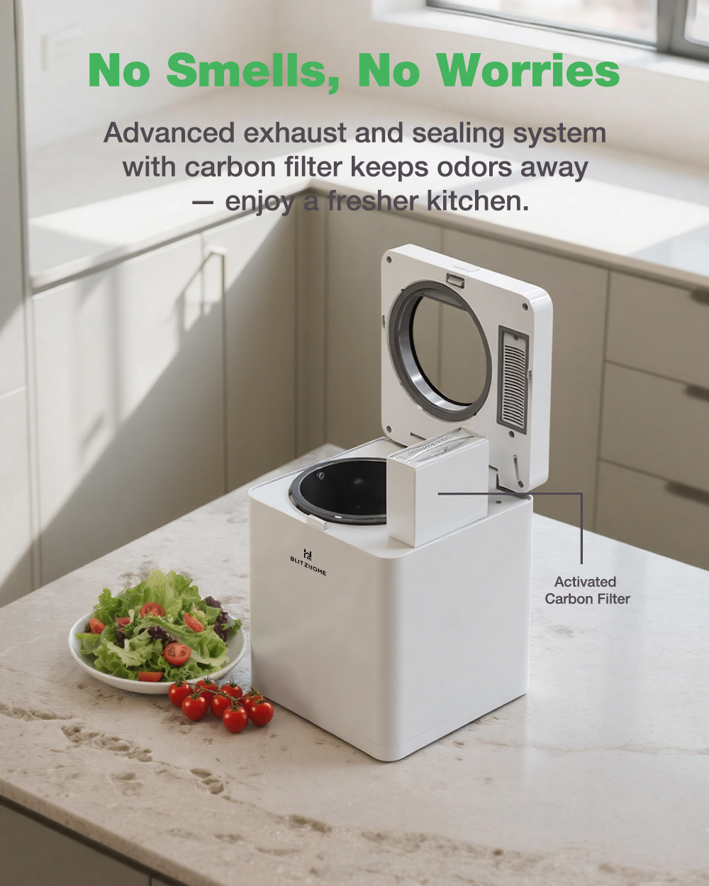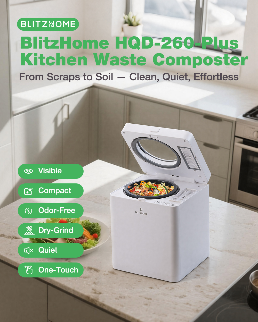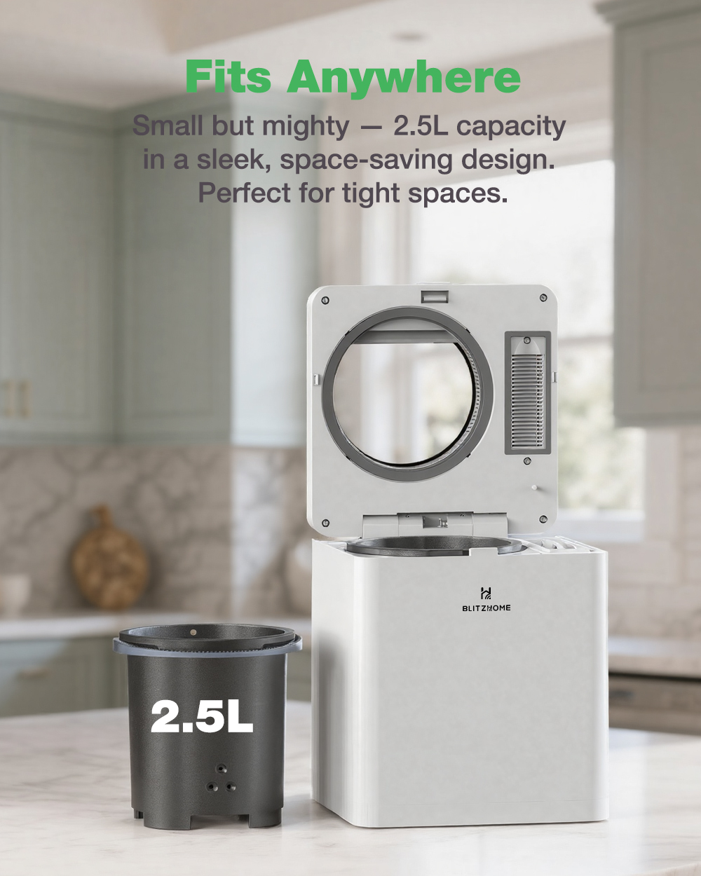 BlitzHome HQD-260-Plus kompakti keittiökompostori 2,5l näkyvä hajuton kolme tilaa hiljainen