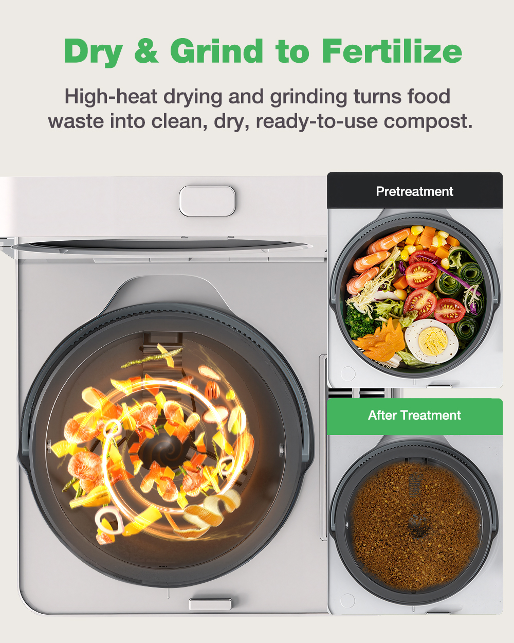 - Ympäristöystävällinen jätteen vähennys: korkealämpöinen kuivaus ja jauhaus pienentävät biojätteen tilavuutta yli 90 % ja muuttavat sen kuivaksi, ravinnepitoiseksi lannoitteeksi kasveille.
