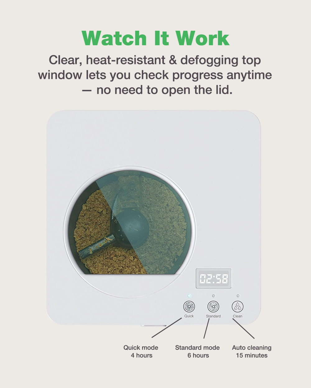 - Näkyvä ja hajuton kompostointi: läpinäkyvä, kuumuutta kestävä ja huurtumaton lasi näyttää kompostointiprosessin, ja kehittynyt poistojärjestelmä sekä aktiivihiili pitävät käytön hajuttomana.
