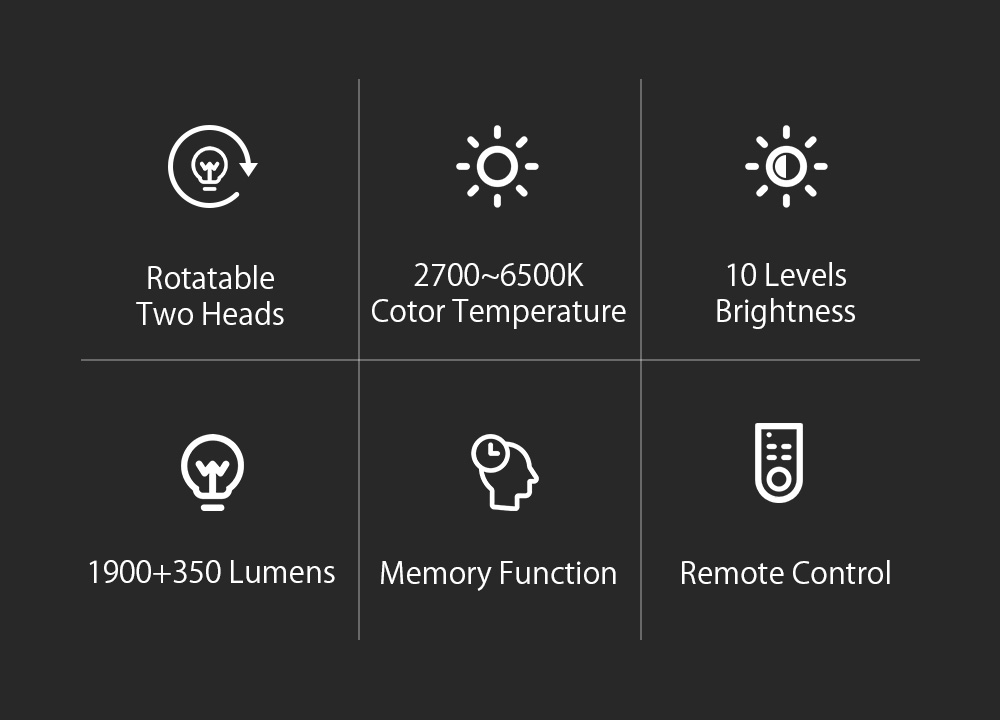 Päävalo kääntyy vaakasuunnassa 350° ja pystysuunnassa 180°. Tunnelmavalon pää on säädettävissä 360°. Valoja voi ohjata erikseen. - 2700K–6500K värilämpötila + 10 kirkkaustasoa