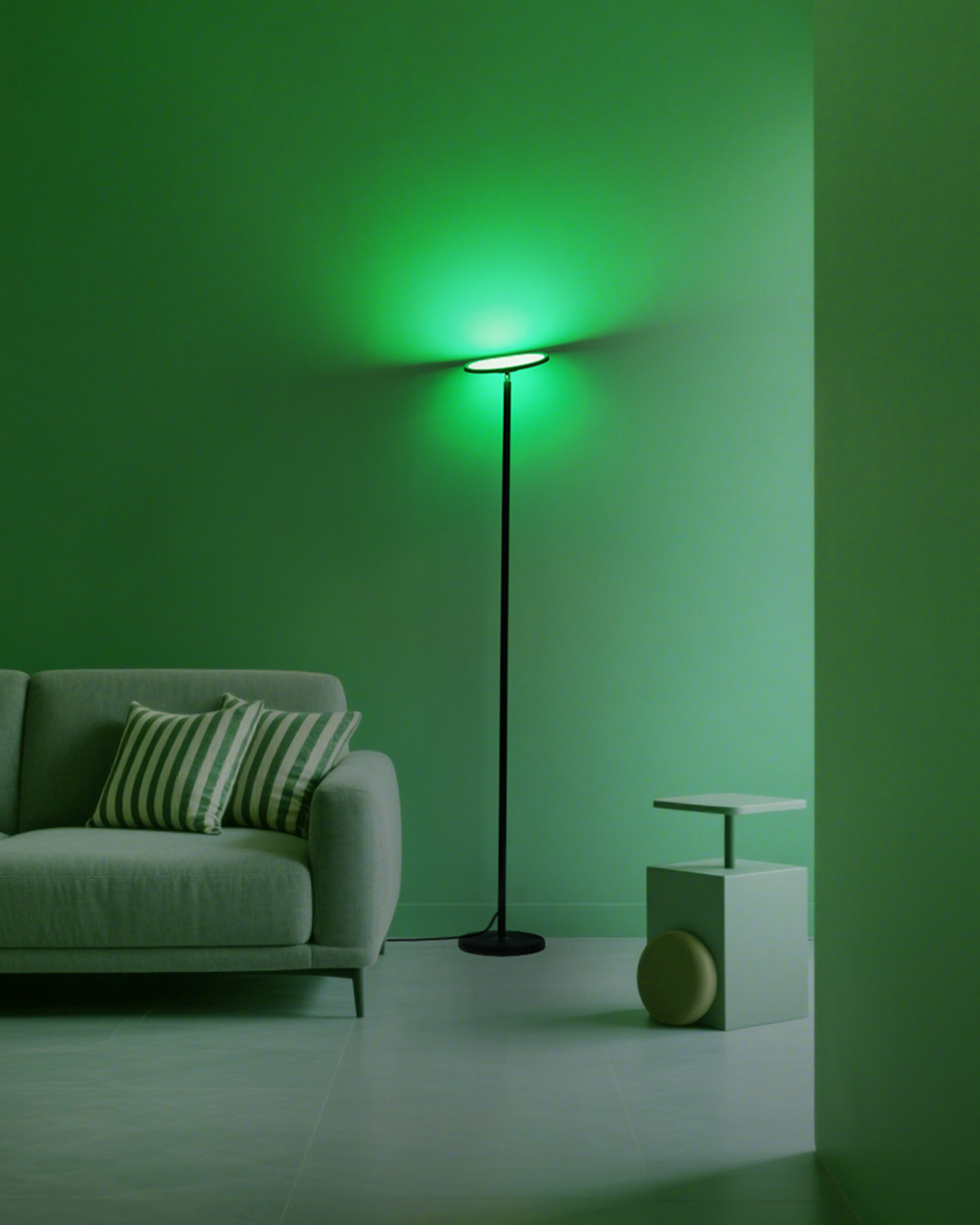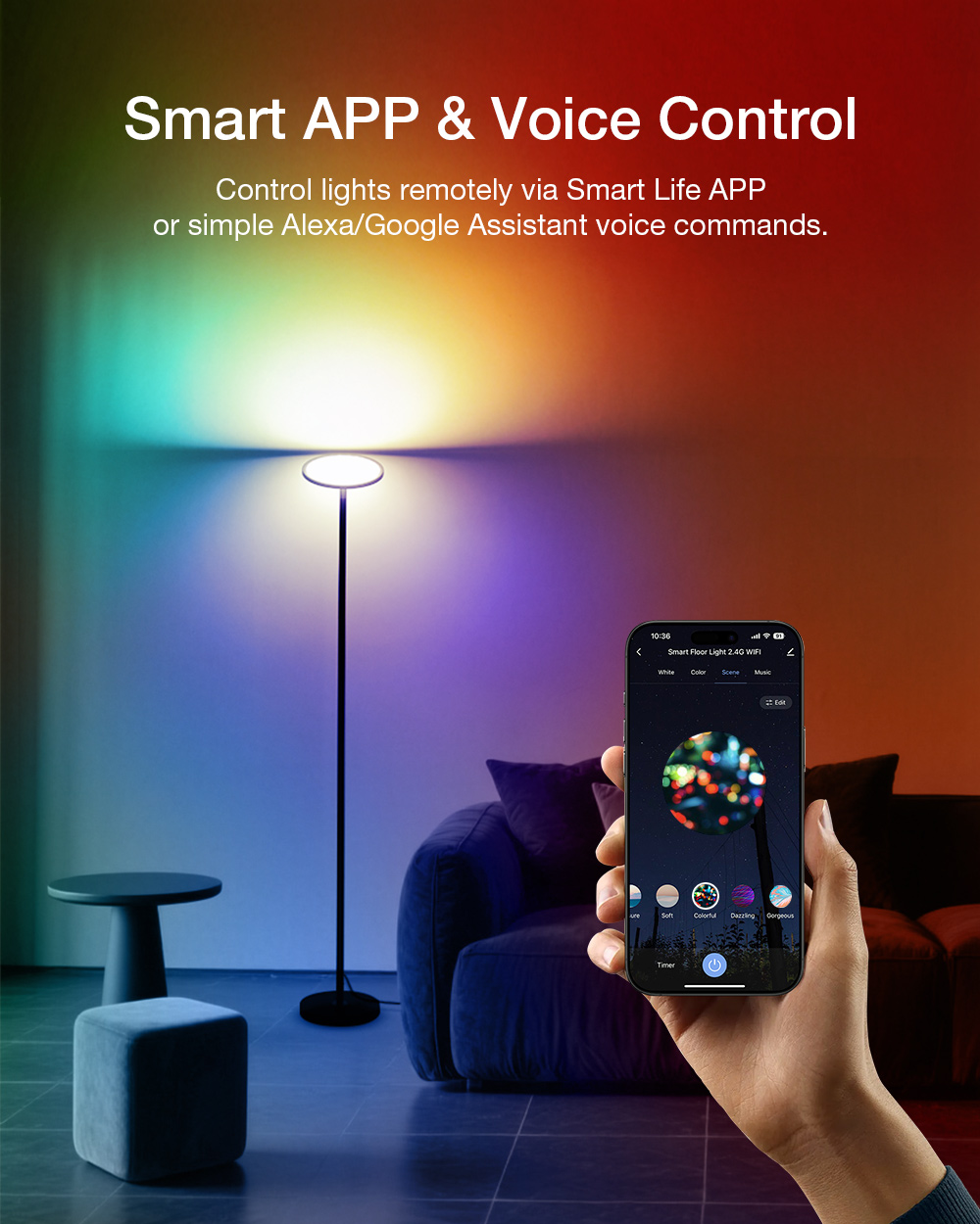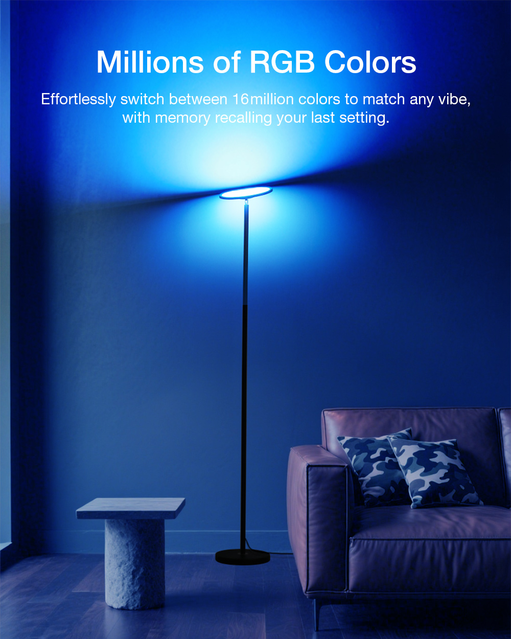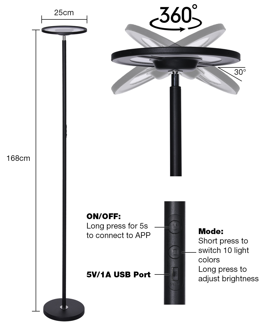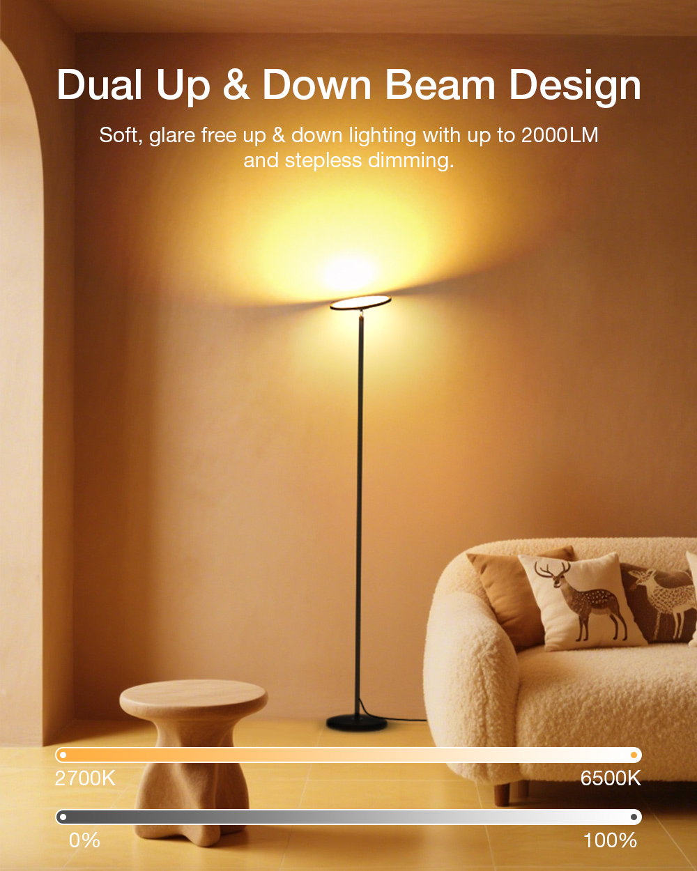- Kaksisuuntainen ylös- ja alasvalo, häikäisemätön valaistus: Pehmeä ja tasainen valo ylös ja alas tuottaa enintään 2000 lm huoneen täyttävää valoa ilman häikäisyä – sopii lukemiseen, televisiokatseluun ja tunnelmavaloksi.