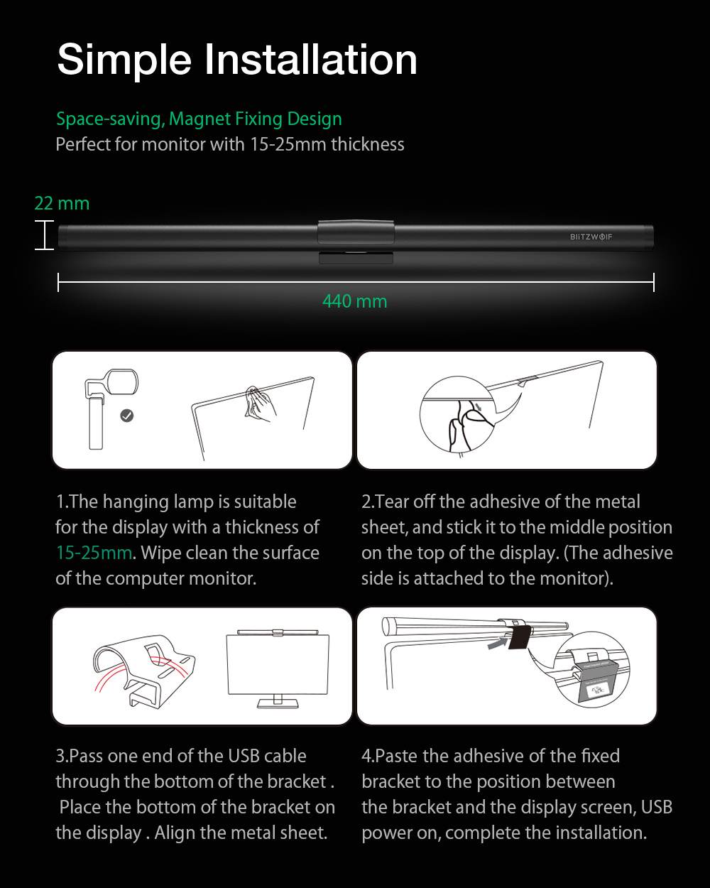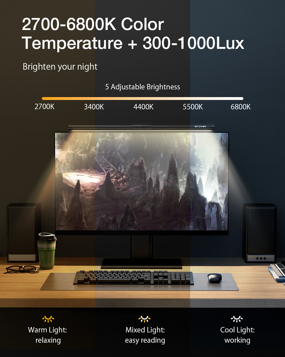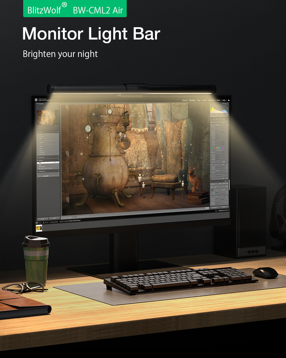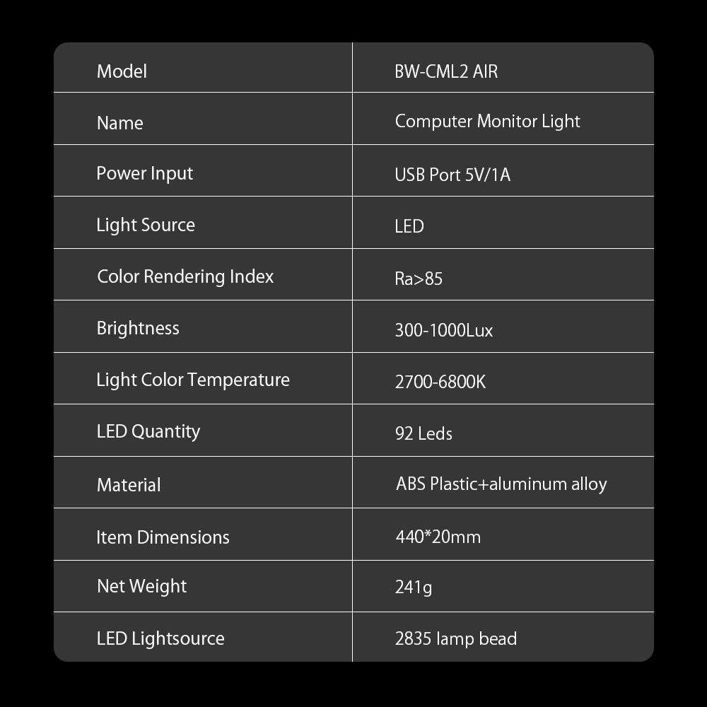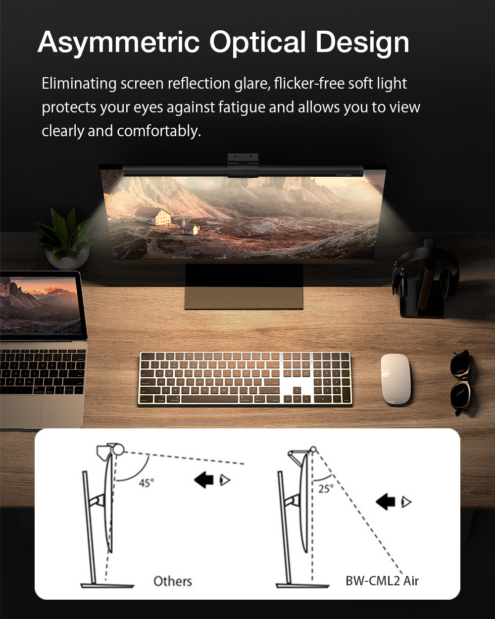 IoT-aikakaudella tietokoneet ovat välttämättömiä työhön, opiskeluun, viihteeseen ja peleihin, mutta liian kirkas tai liian himmeä valo rasittaa silmiä. BW-CML2 Air monitor light tarjoaa työpöydälle suunnatun valaistusratkaisun, joka hyödyntää näyttötilan valonlähdetekniikkaa.