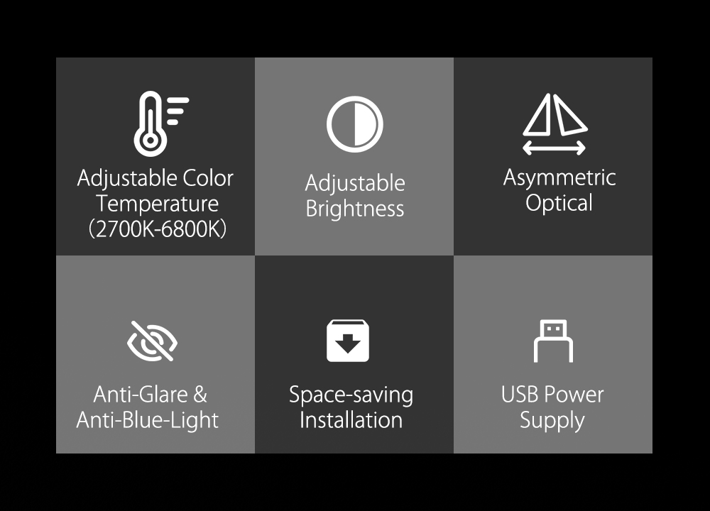 • Vähentää näytön heijastuksia ja silmien rasitusta. Häikäisemätön, kirkas ja pehmeä valo parantaa näkyvyyttä ja käyttömukavuutta.