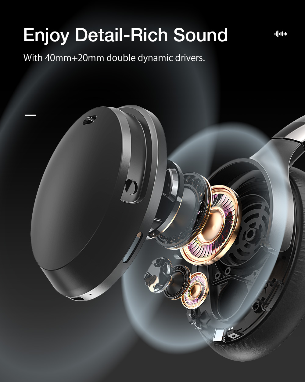 - Yksityiskohtainen ääni: 40 mm + 20 mm -kaksoisdynaamiset elementit.