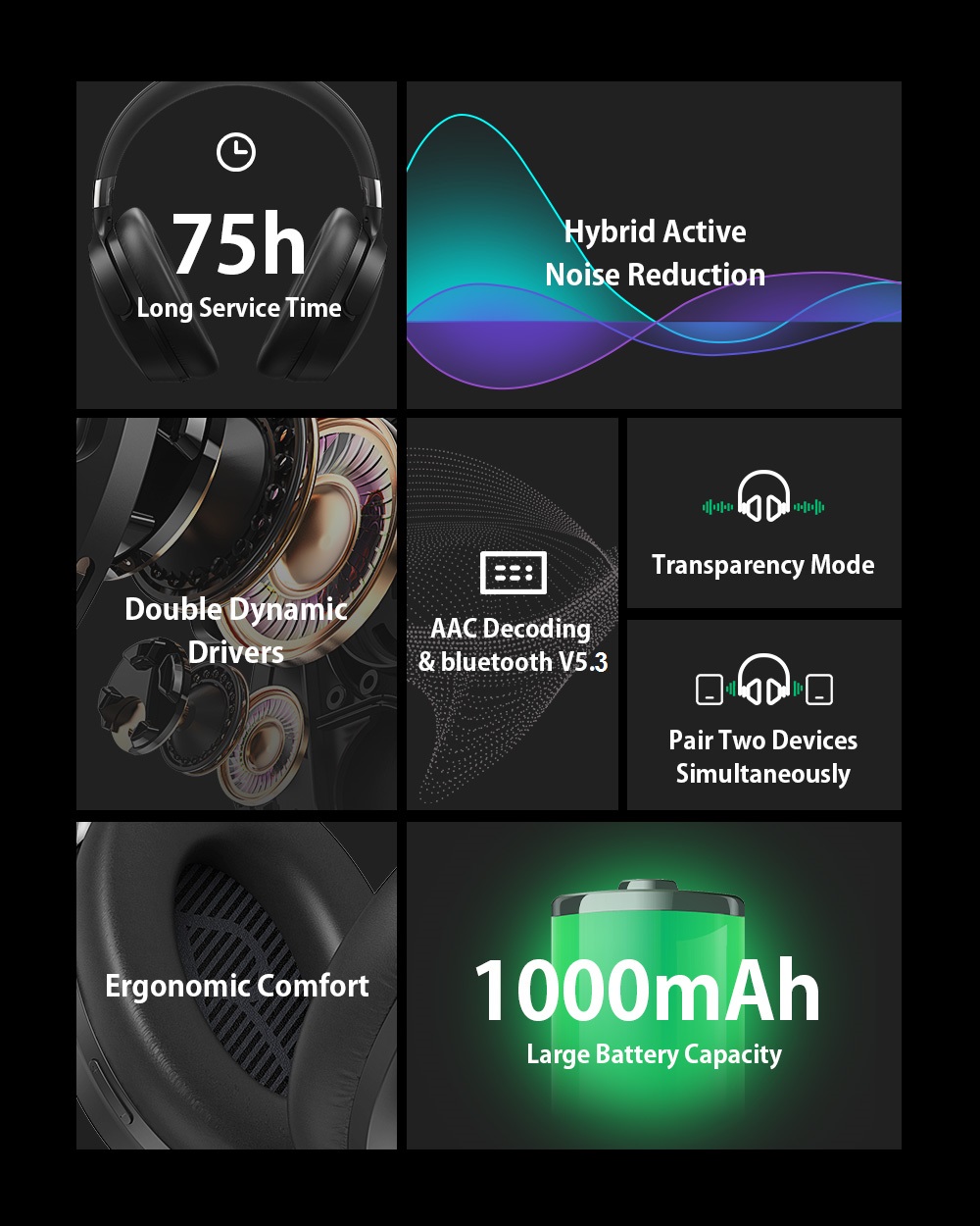 - Pitkä akunkesto: jopa 75 tuntia ilman ANC:tä ja 50 tuntia ANC-tilassa.