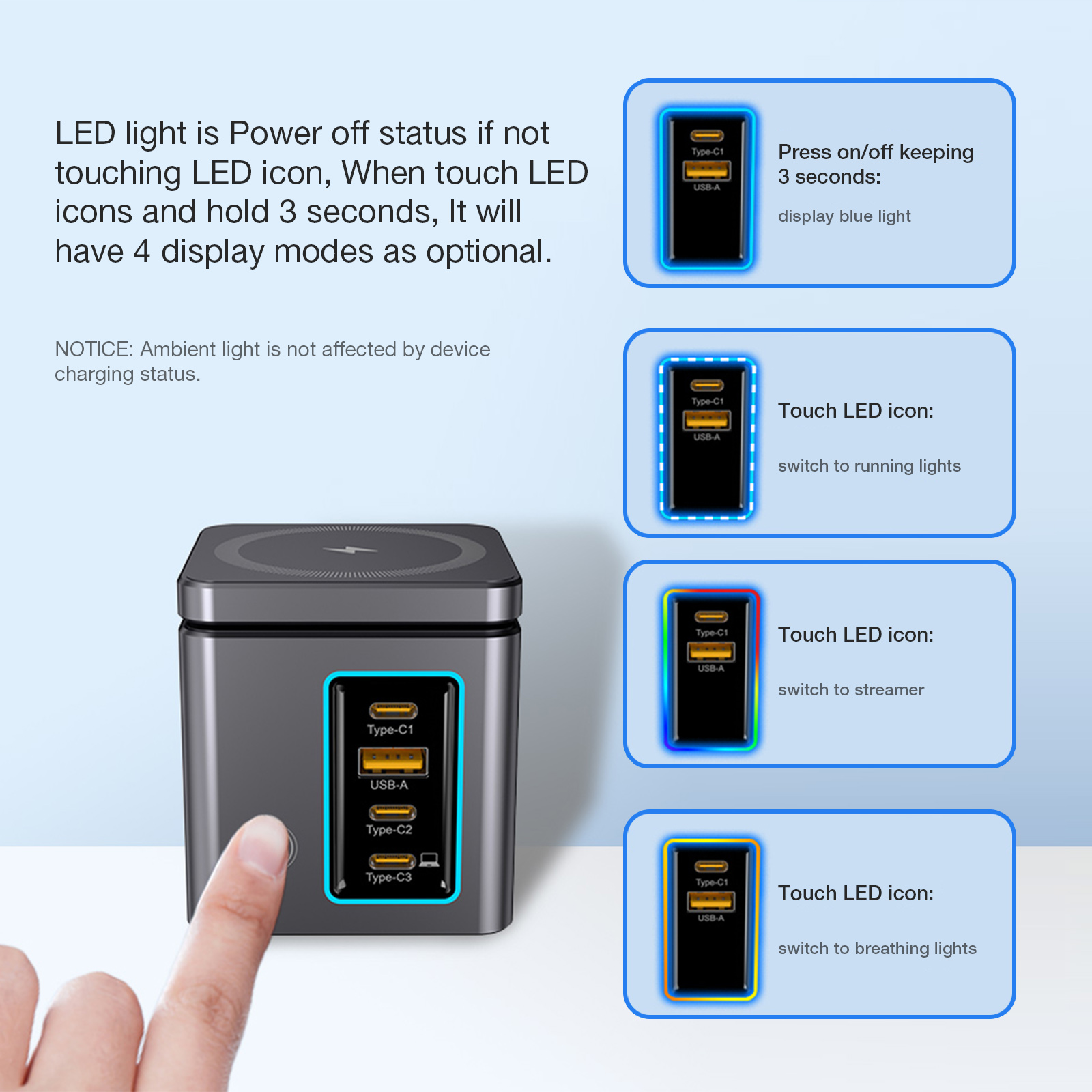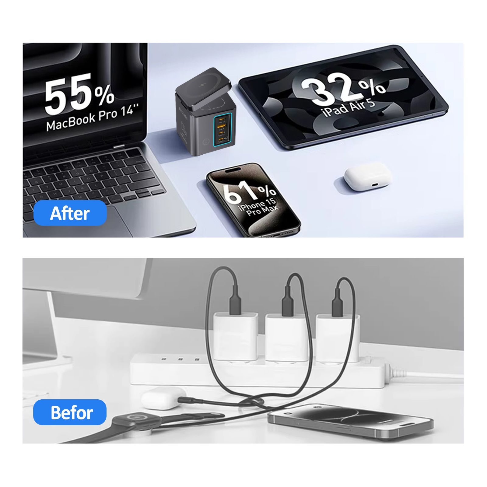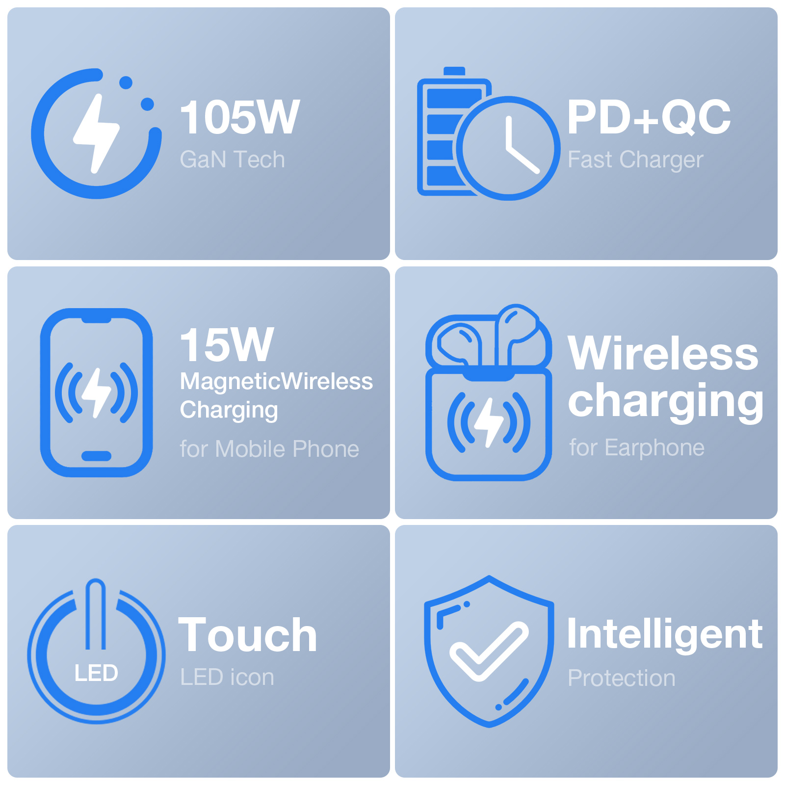 Monipuolinen 105W GaN-pöytälaturi, joka lataa useita laitteita samanaikaisesti turvallisesti ja tehokkaasti. Selkeä LED-merkkivalo näyttää lataustilan yhdellä silmäyksellä.