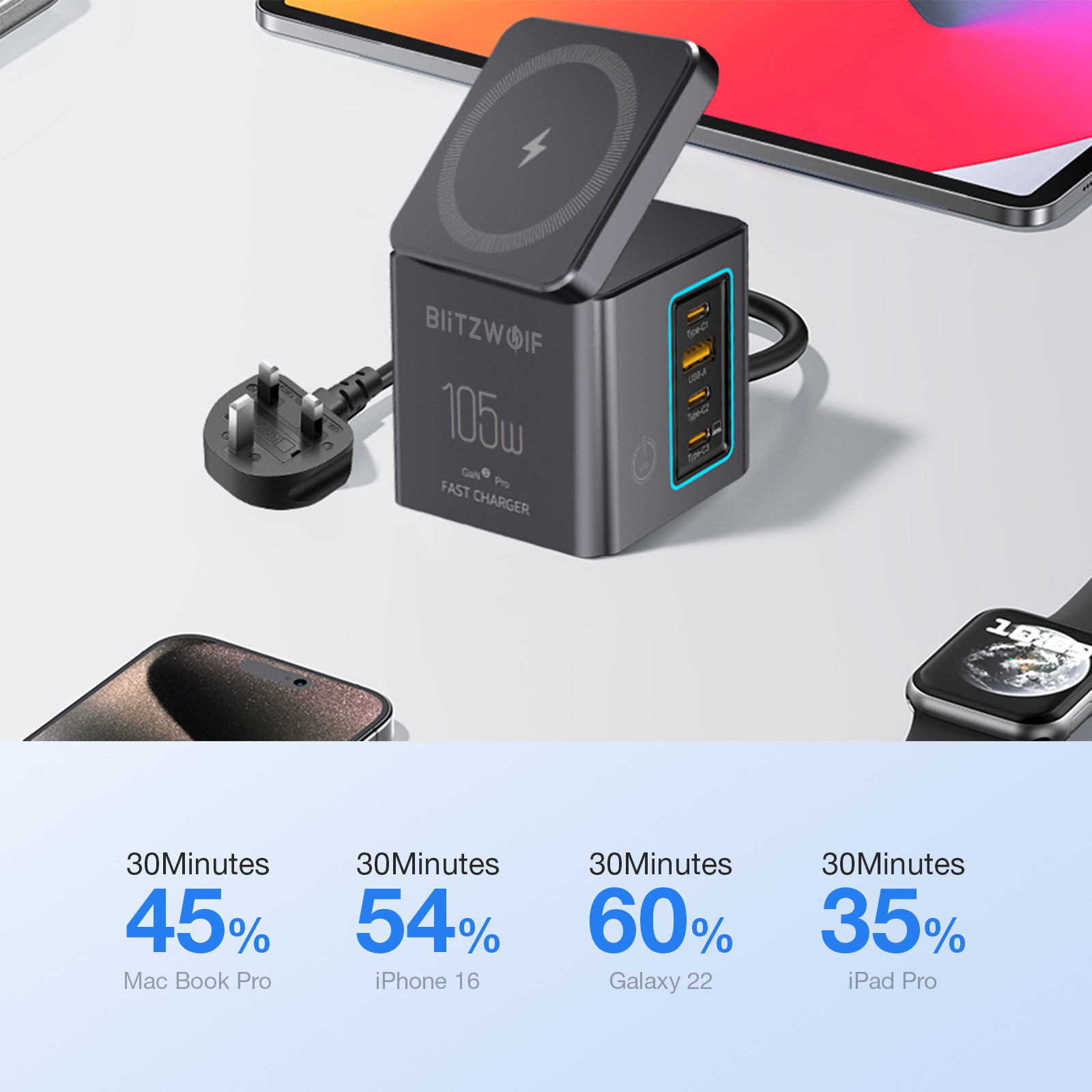 4. Pikalataus: Saavuttaa merkittävän varauksen 30 minuutissa – 45% MacBook Pro, 54% iPhone 16, 60% Galaxy 22 ja 35% iPad Pro.