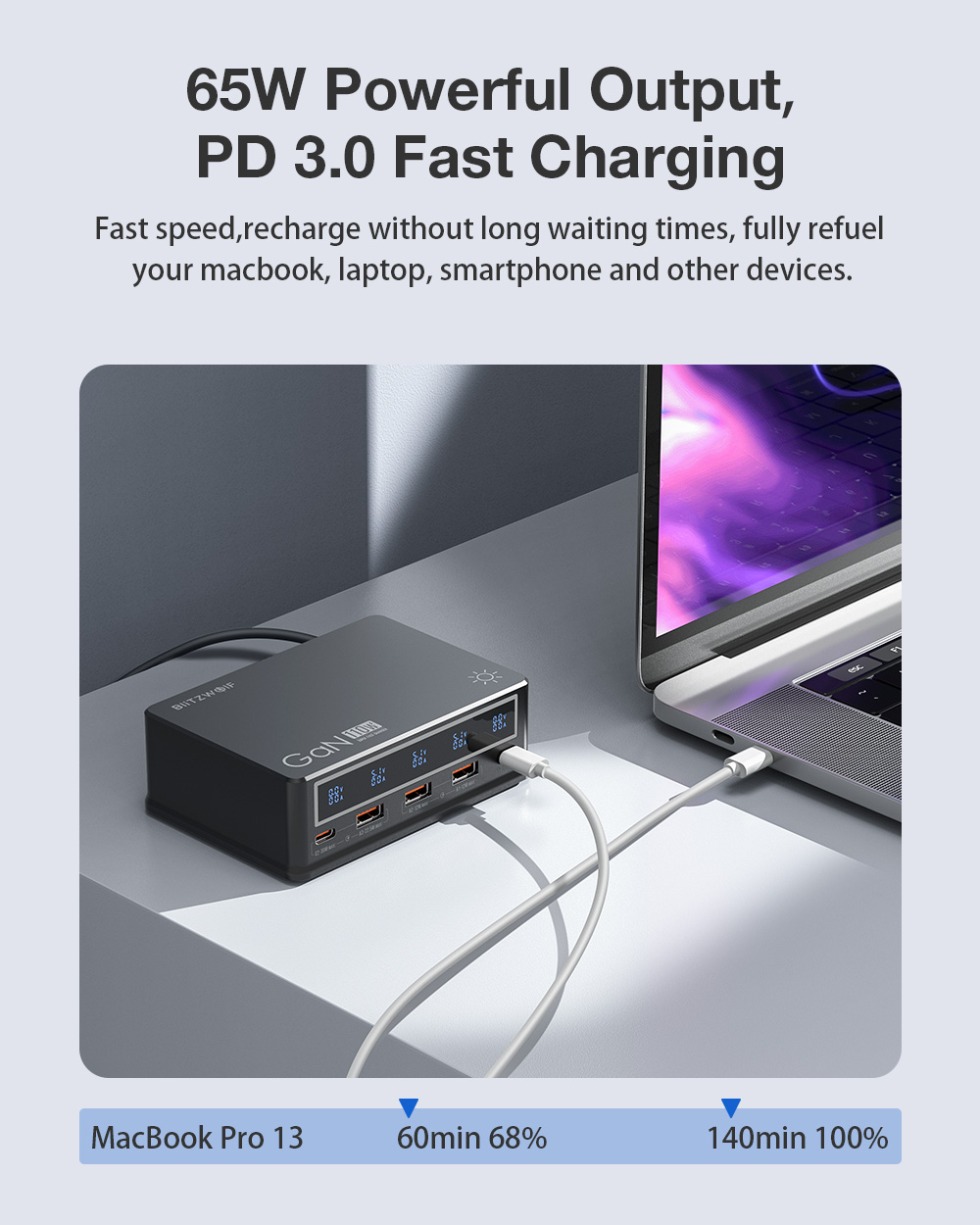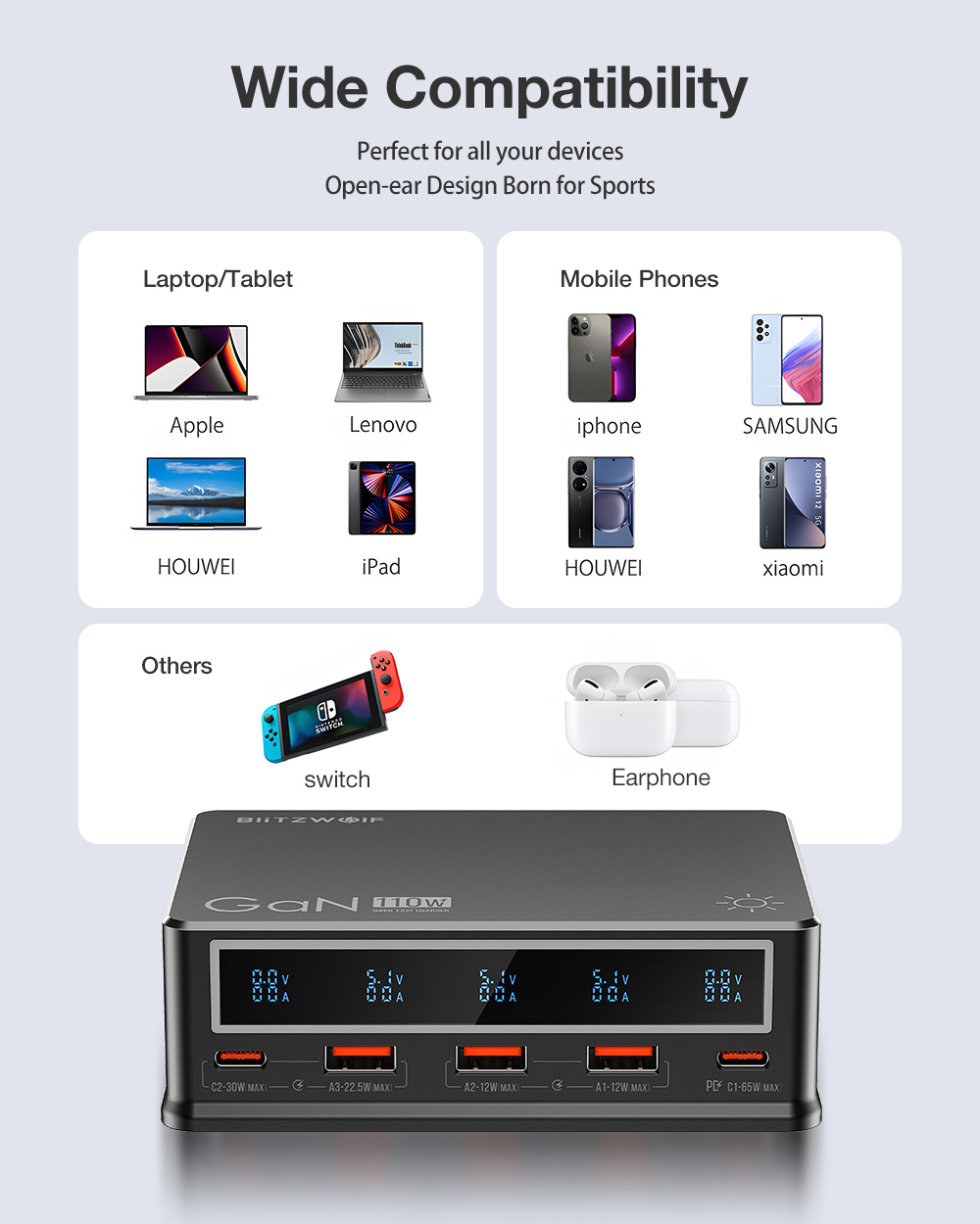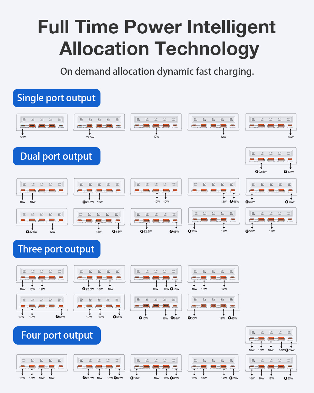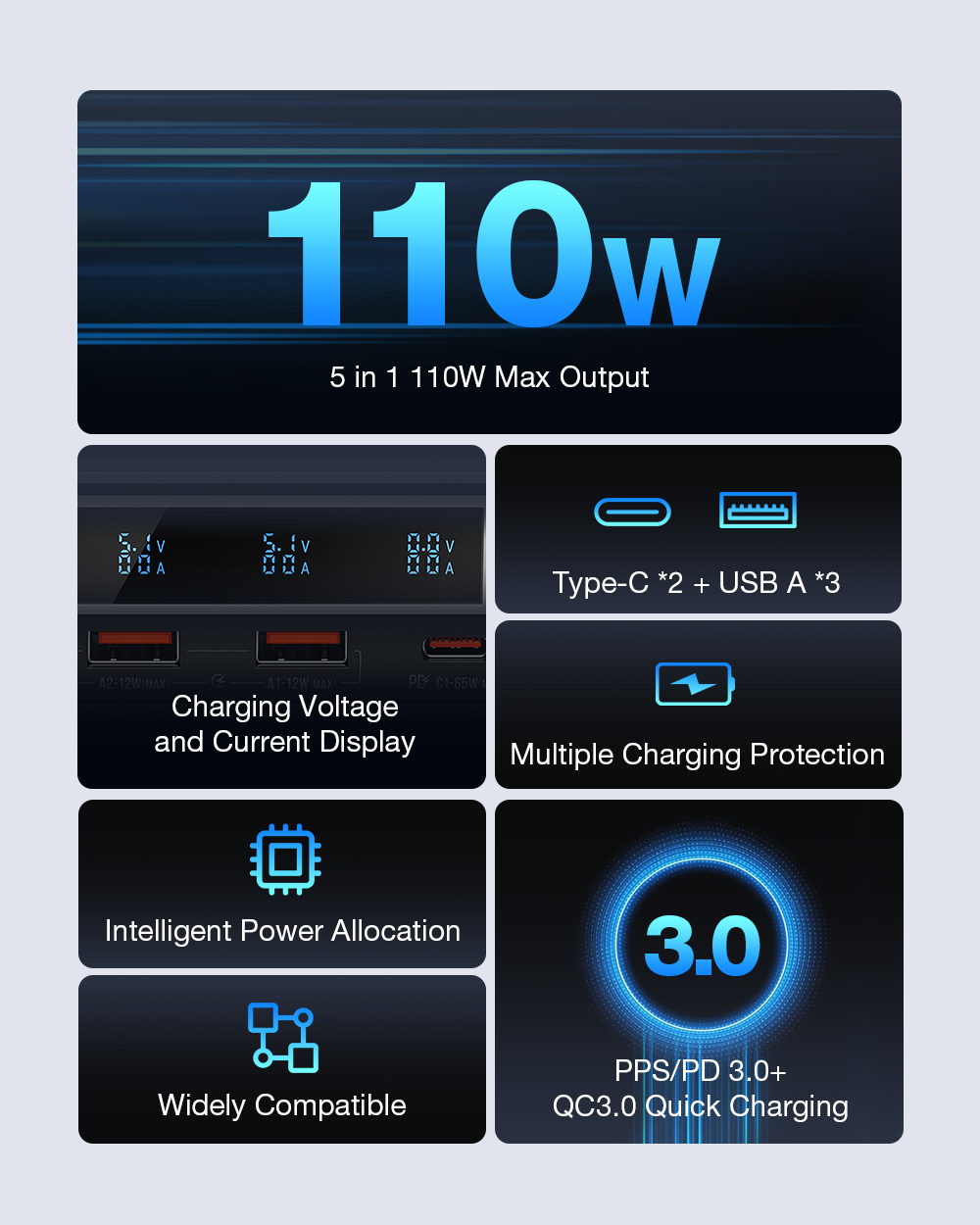 - Nopea lataus: enintään 110W kokonaistuotto. Yhden laitteen lataus jopa 65W, Type-C-laitteille jopa 65W ja USB-A-laitteille jopa 42.5W.