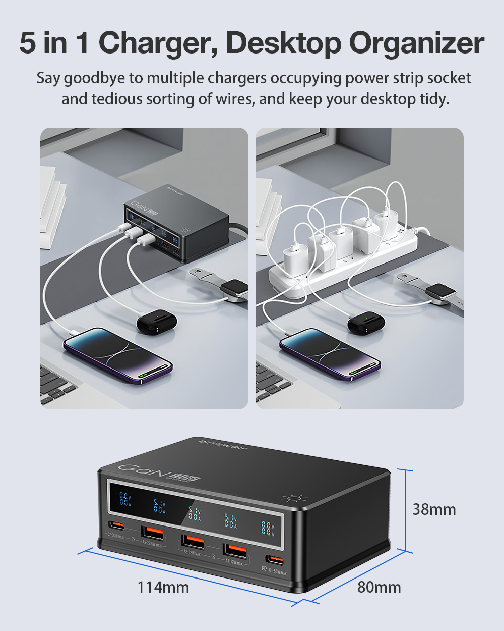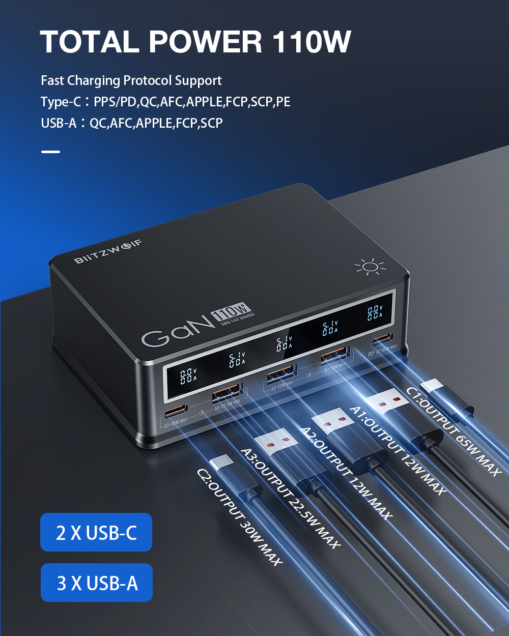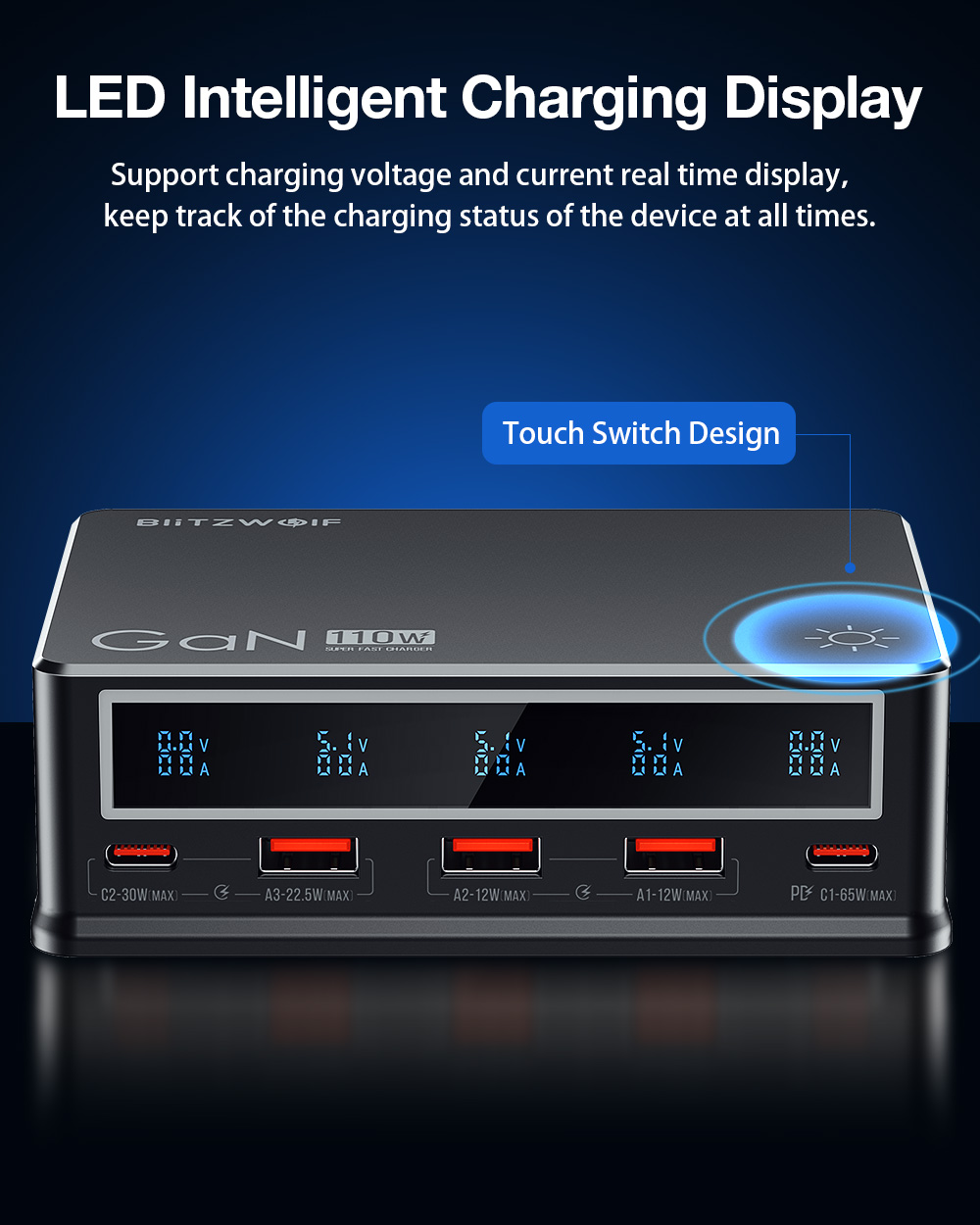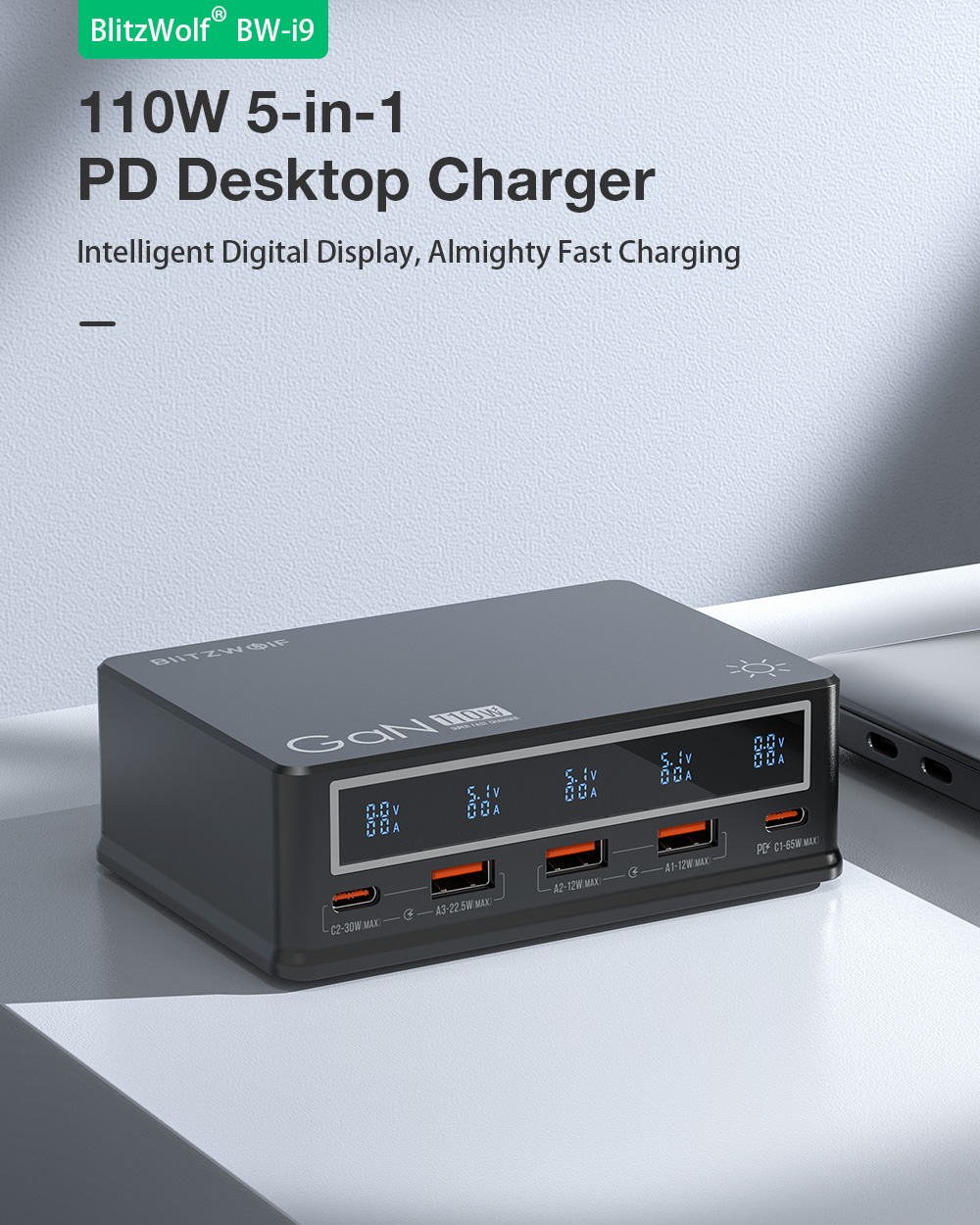 Blitzwolf BW-i9 110W 5-porttinen USB-C ja USB-A pöytälaturi digitaalinen näyttö