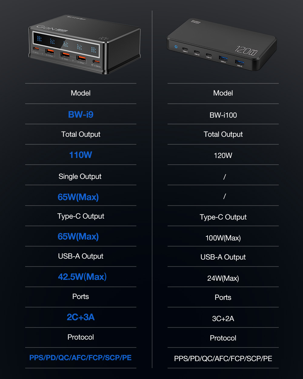 Kokonaisteho: 110W C1-ulostulo: PPS 3.3V-21V-3A, 5V/3A, 9V/3A, 12V/3A, 15V/3A, 20V/3.25A (65W maks.) C2-ulostulo: PPS 3.3V-11V-3A, 5V/3A, 9V/3A, 12V/2.25A, 20V/1.5A (30W maks.) A3-ulostulo: 5V/3A, 9V/2A, 12V/1.5A, 4.5V/5A, 5V/4.5A (22.5W maks.) A1-ulostulo: 5V/2.4A (12W maks.) A2-ulostulo: 5V/2.4A (12W maks.) |