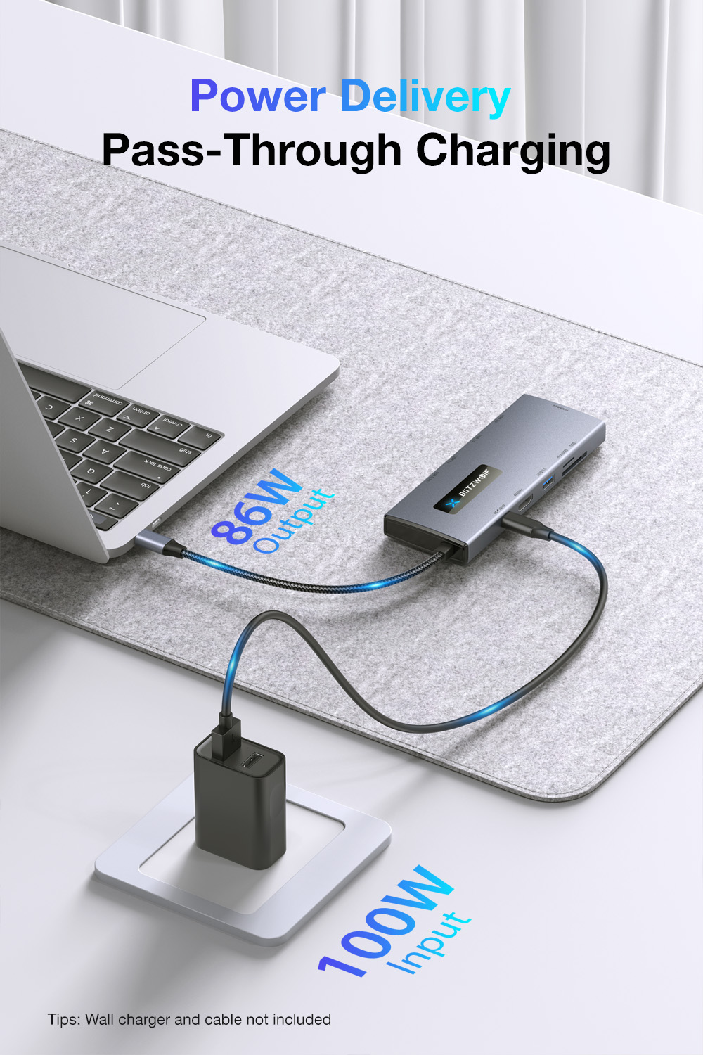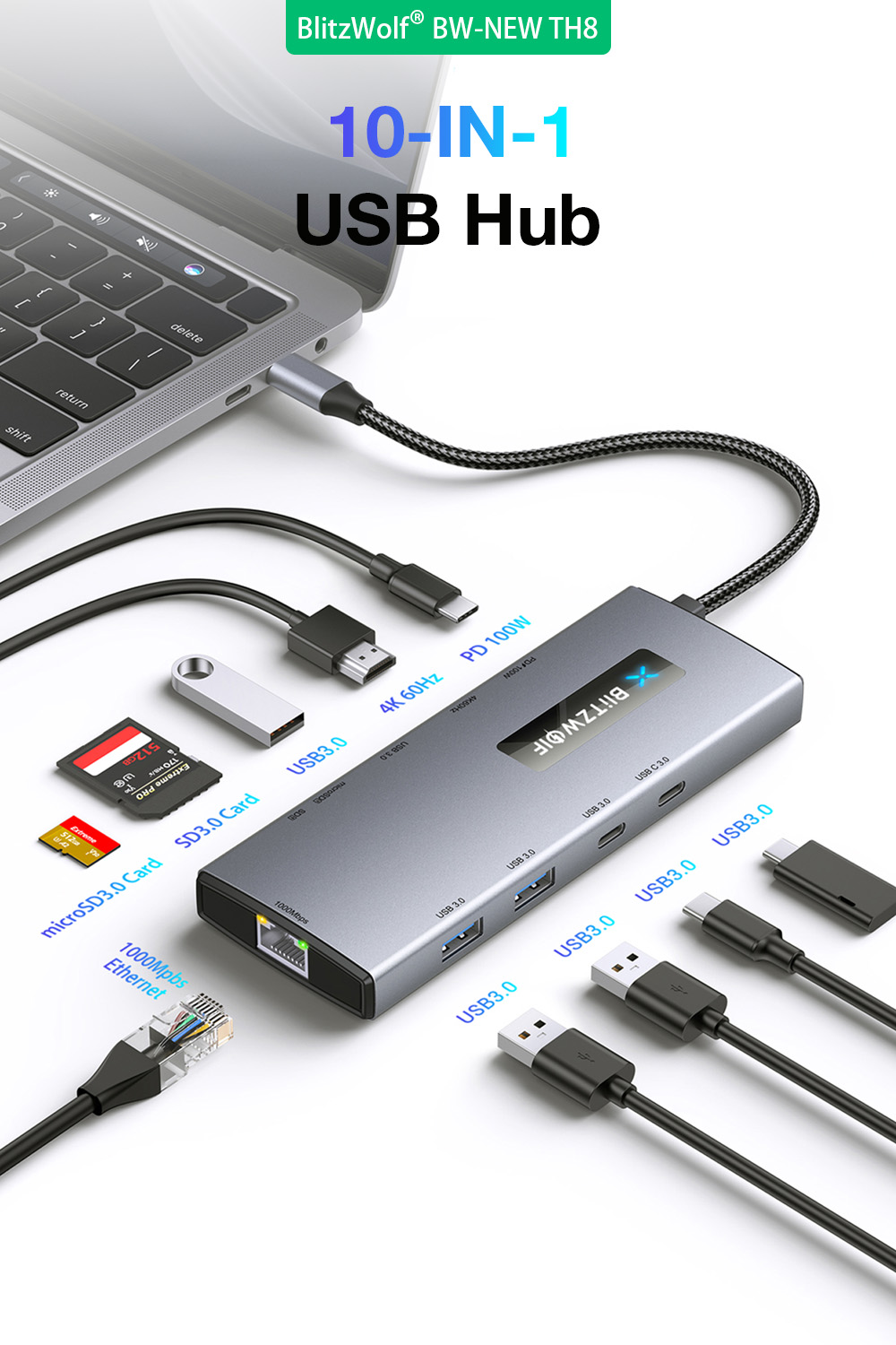 BlitzWolf BW-NEW TH8 10-toimintoinen USB-C-keskitin 100W PD-lataus 4K60 SD/TF RJ45
