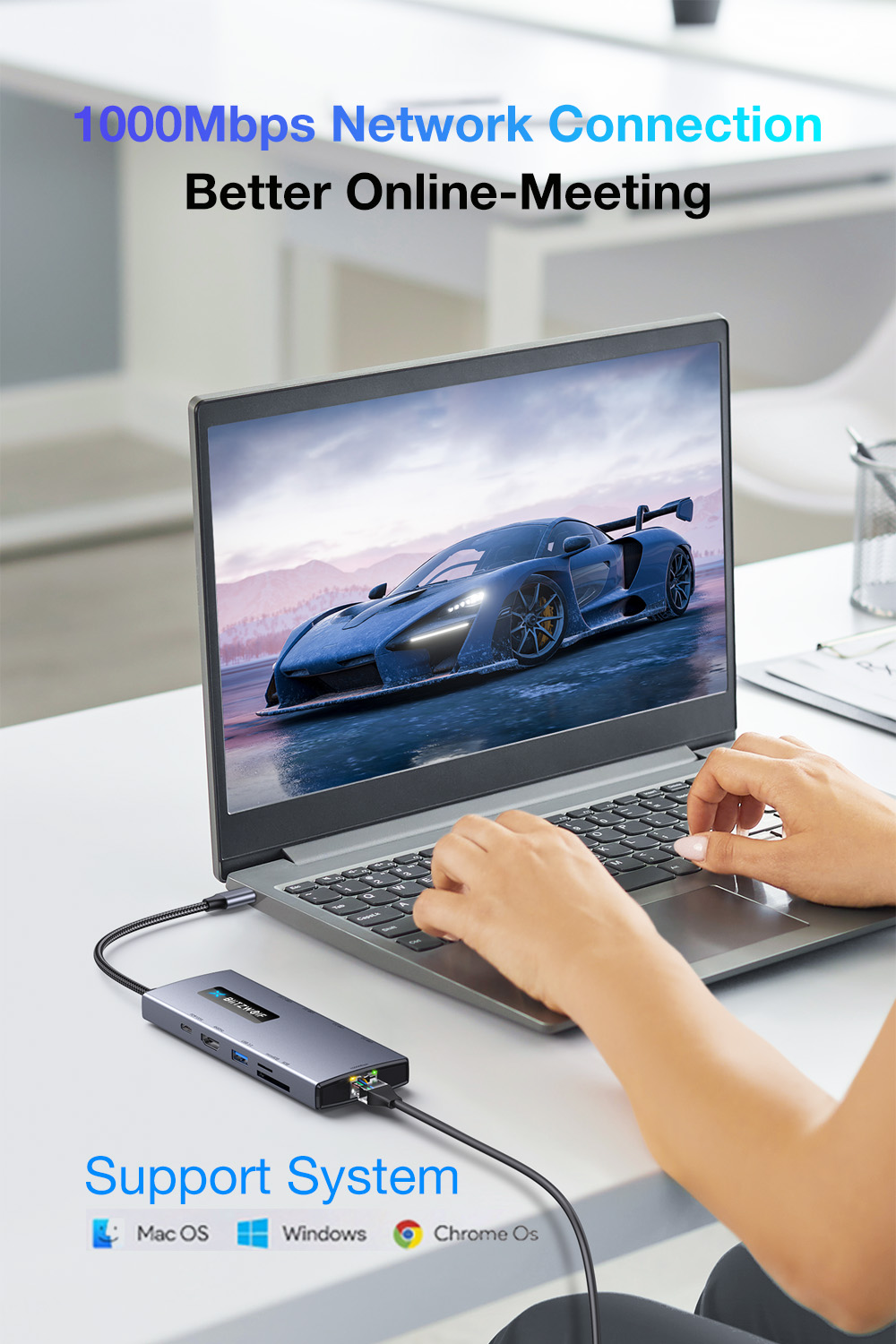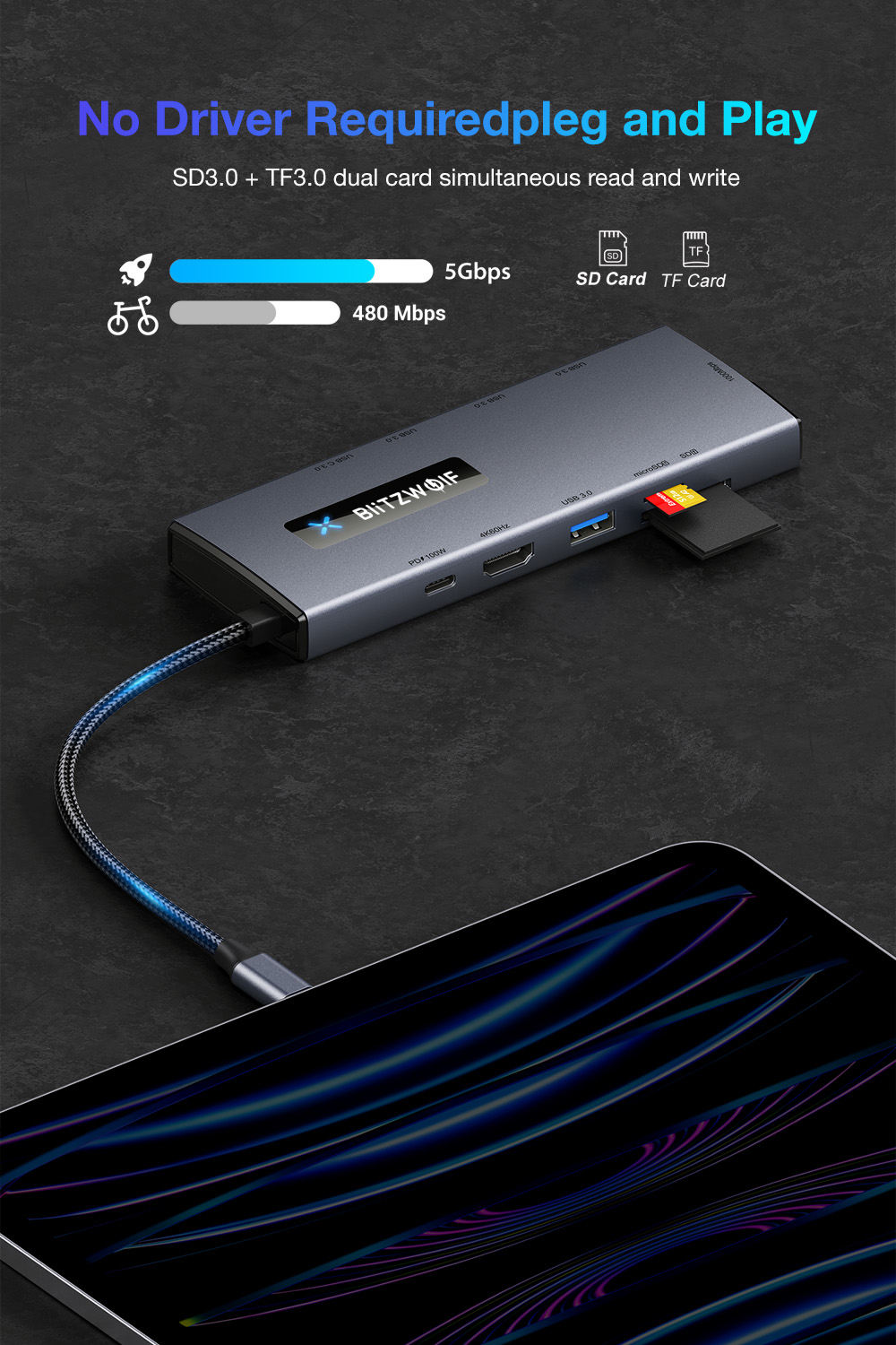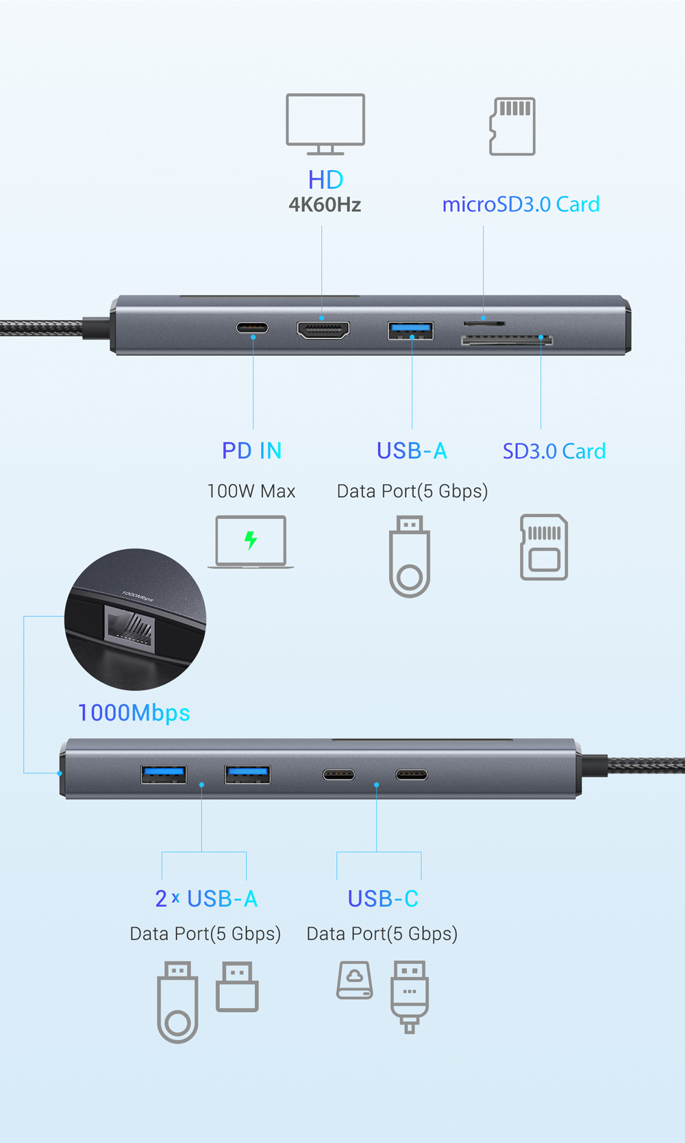 Kompakti 10-liitäntäisen telakointiaseman ratkaisu tietokoneille ja TYPE-C -puhelimille. Alumiiniseoksesta valmistettu runko, useita nopeita liitäntöjä (mm. USB 3.0, USB-C 3.0, PD-lataus 100W, 4K@60Hz -näyttö, SD/TF 3.0) sekä gigabitin verkko tekevät päivittäisestä työstä ja viihteestä sujuvaa.