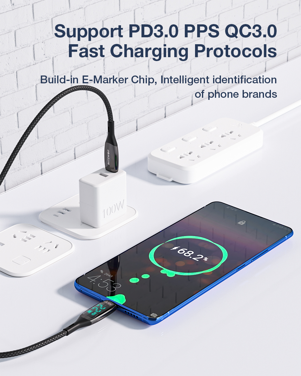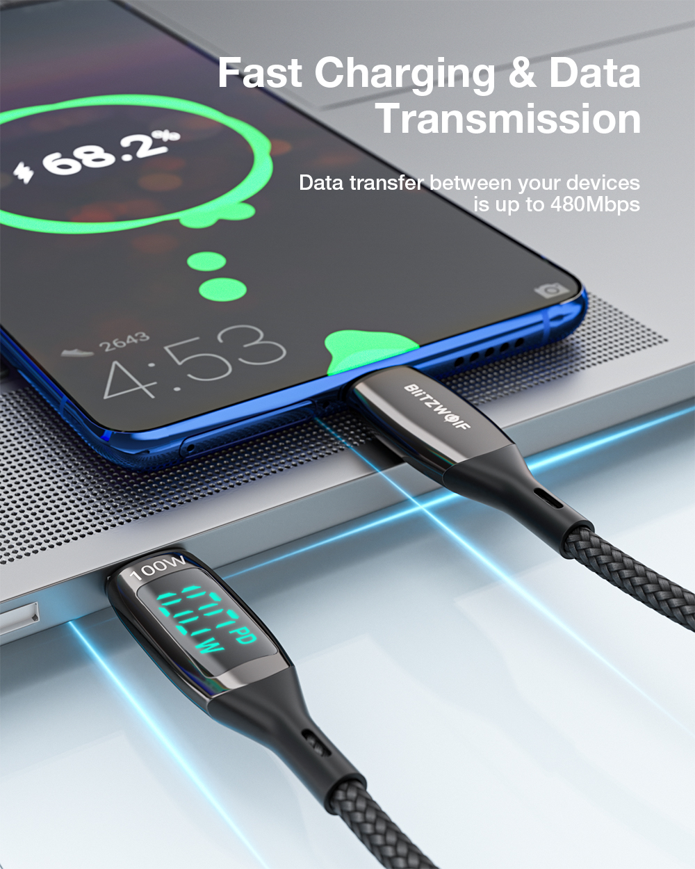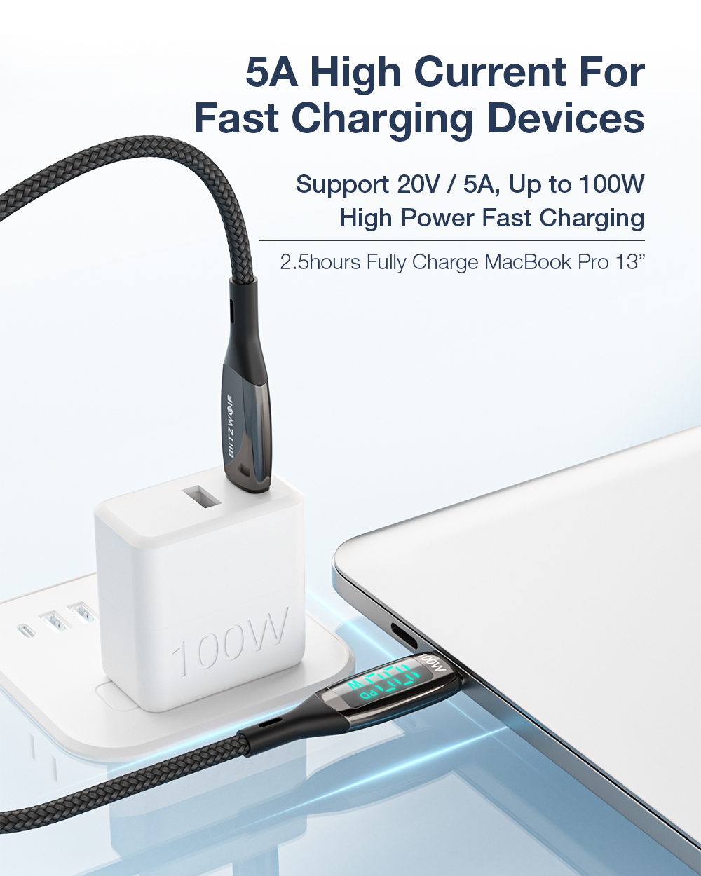 BlitzWolf BW-TC23 100W C-tyyppi kaapeli LED-näyttö 5A PD3.0 nopea tiedonsiirto