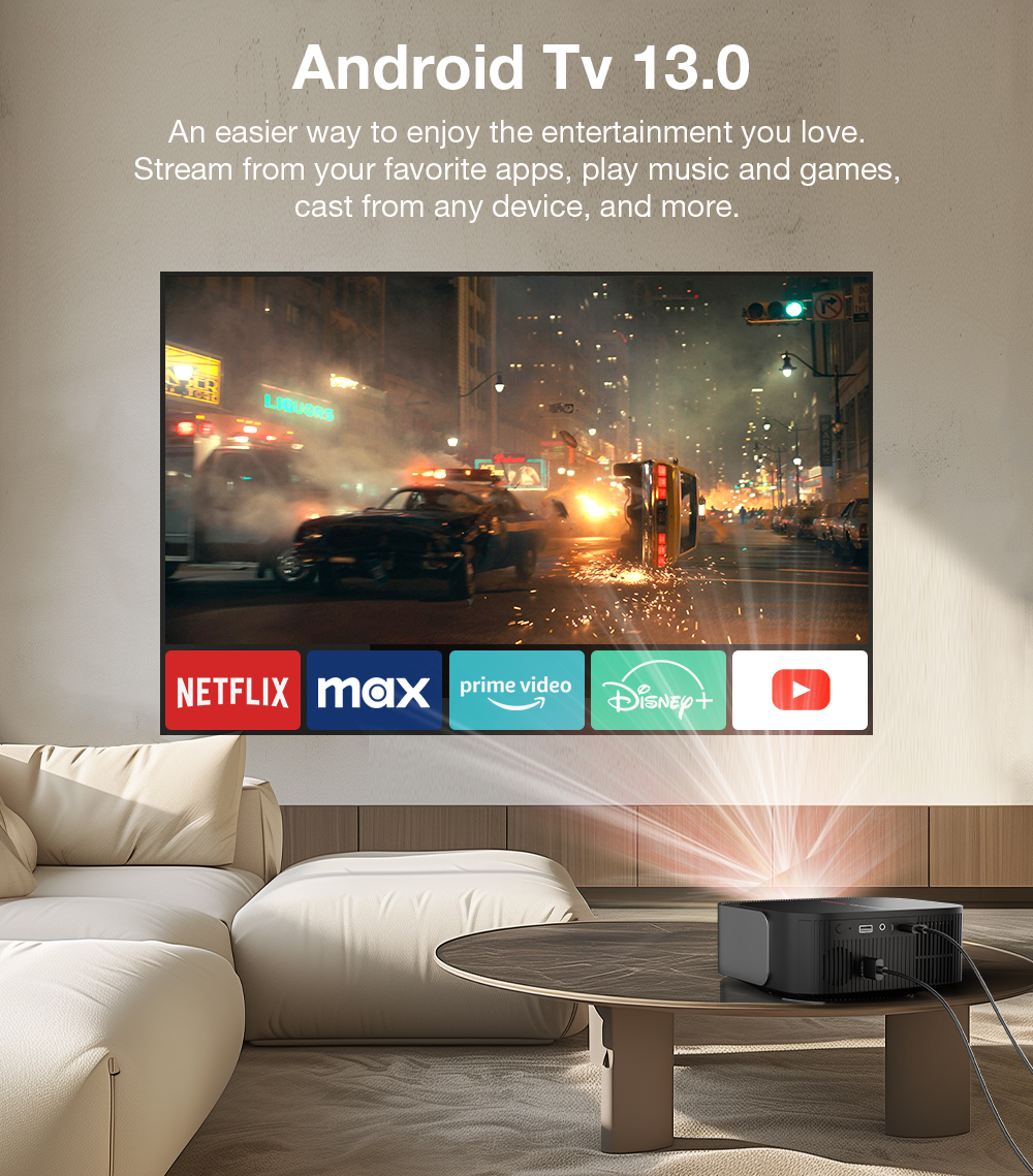 Caiwei A9G 4K Android TV 14.0 Netflix- ja Google TV -sertifioitu 1900 ANSI-lumenin projektori