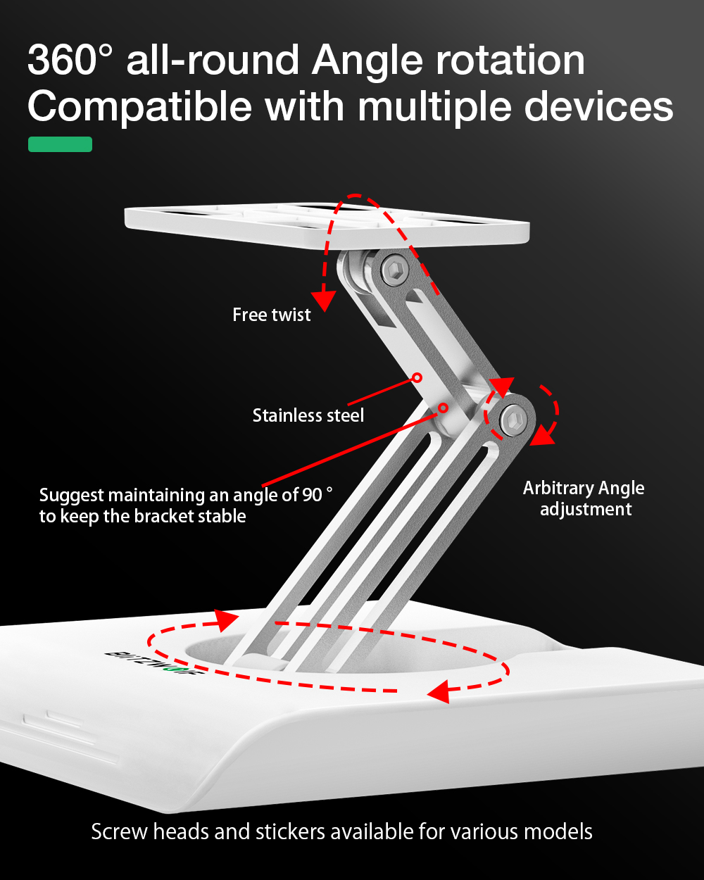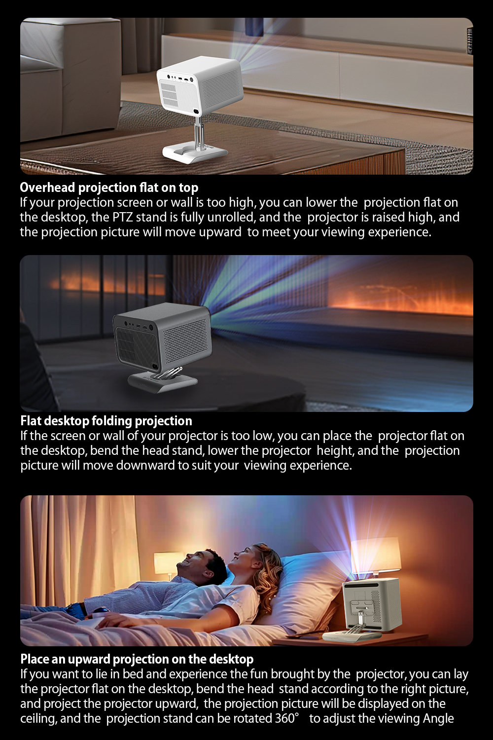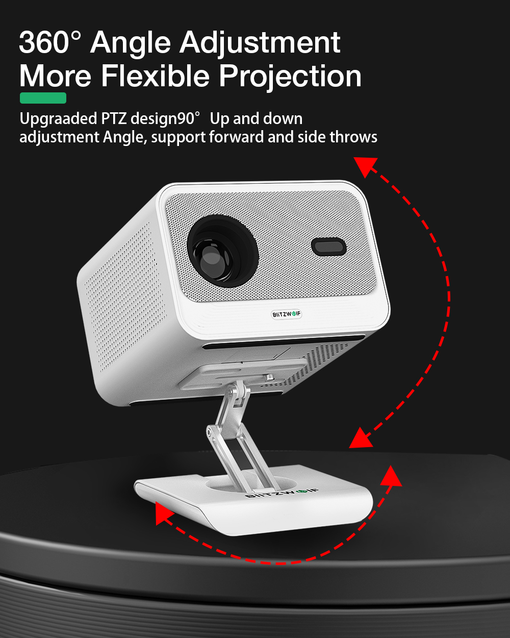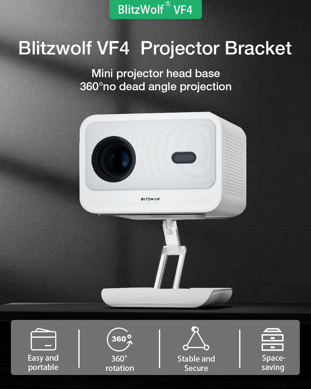 BlitzWolf® BW-VF4 360° Rotation Projector Bracket Desktop Stand Mini Projector Head Base on kompakti ja vakaa pöytäteline, joka helpottaa projektorin suuntaamista. 360° kääntyvä rakenne ja kallistussäätö mahdollistavat tarkan kuvan kohdistuksen kotiteatteriin, toimistoon tai matkakäyttöön. Luja perusta pitää laitteen paikallaan, ja siisti muotoilu sopii eri ympäristöihin.