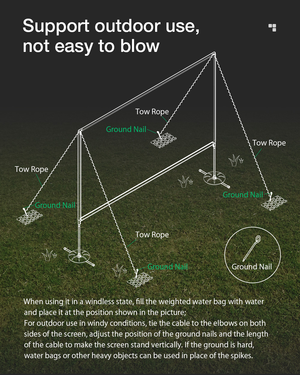 3. Soveltuu myös tuulisissa ulko-olosuhteissa, rakenteessa on kuituköysilaite ja vastapainot.
