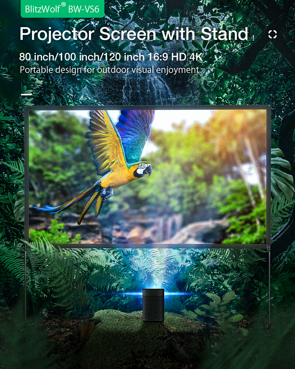 BlitzWolf BW-VS6 kannettava projektorin valkokangas jalustalla 80/100/120 tuumaa 16:9 4K-resoluutio taitettava