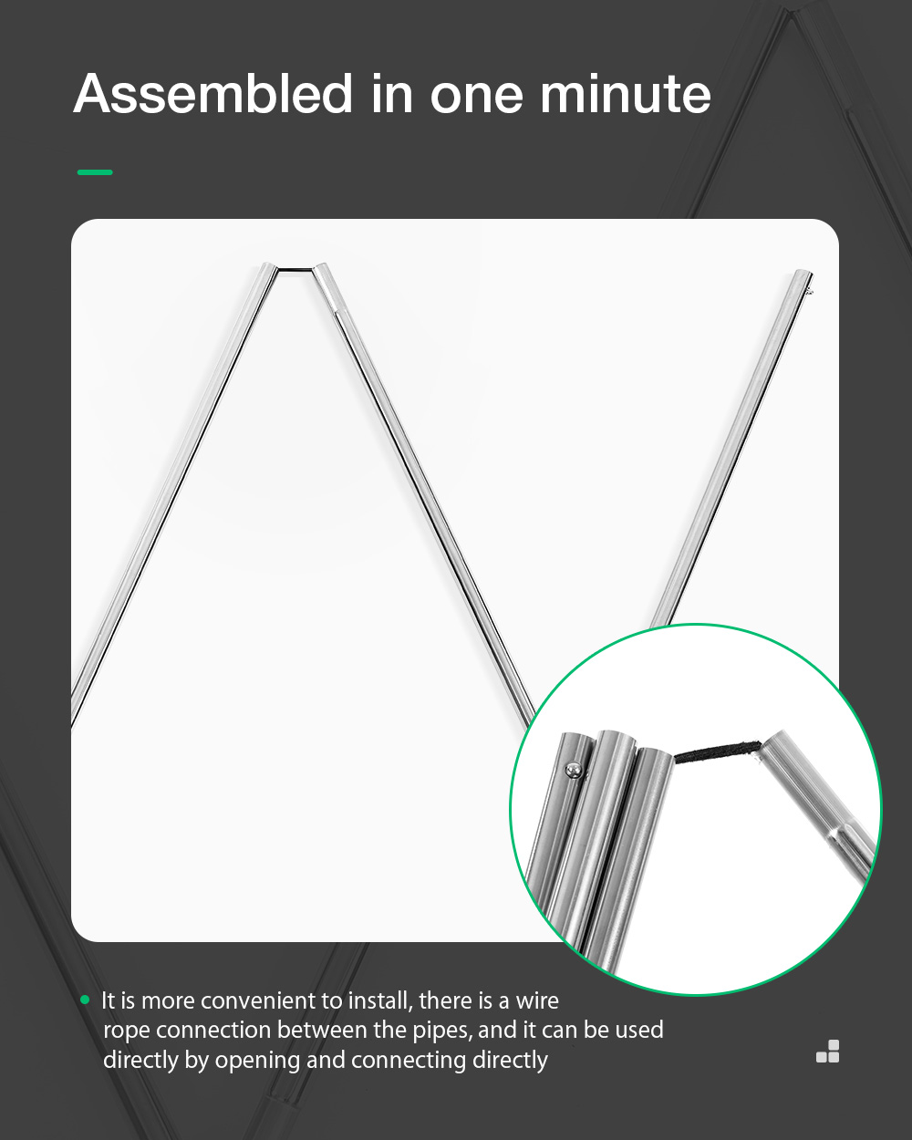 2. Kehys on valmistettu 201-ruostumattomasta teräksestä tehdyistä putkista, jotka liitetään useista osista. Jokaisen sauvaryhmän putkissa on joustonyörit helpottamassa kokoamista ja vähentämässä virheitä, kangas voidaan myös taittaa vapaasti, joten paketti on pieni ja helppo kuljettaa purkamisen jälkeen.