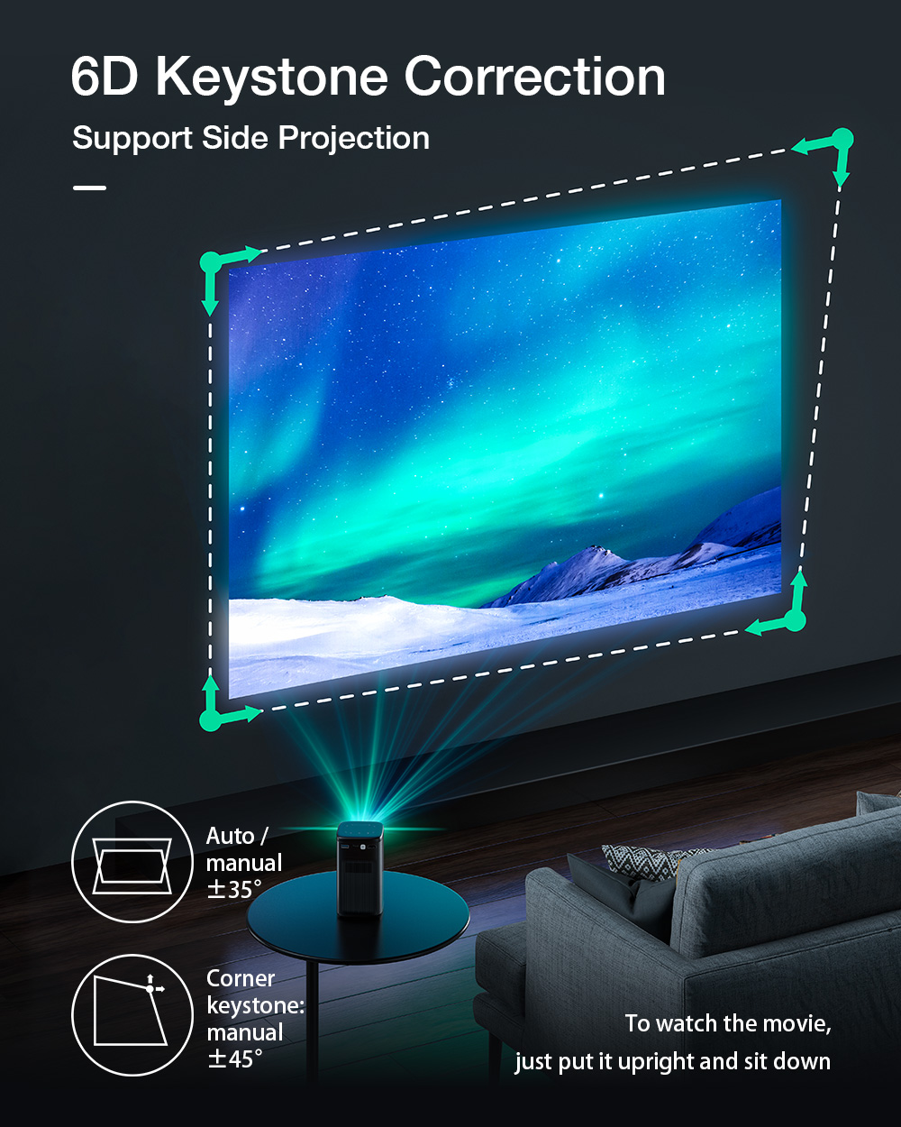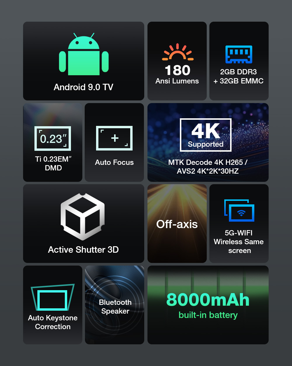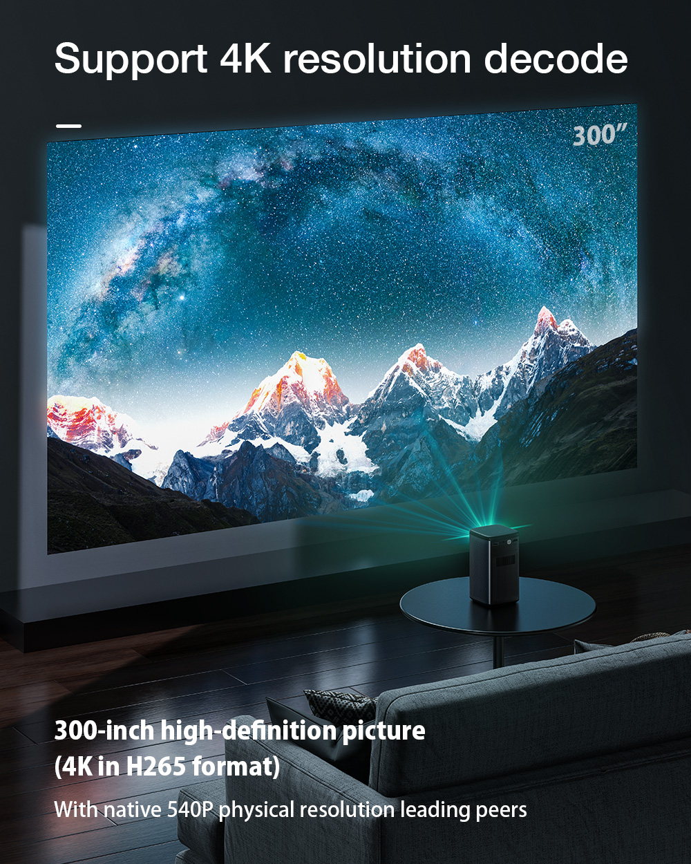 Kompakti DLP-projektori, jossa on Android 9.0, tarjoaa sujuvan käytön ja pääsyn sovelluksiin. 1080P-tuettu toisto näyttää yksityiskohdat selkeinä ja värit luonnollisina.