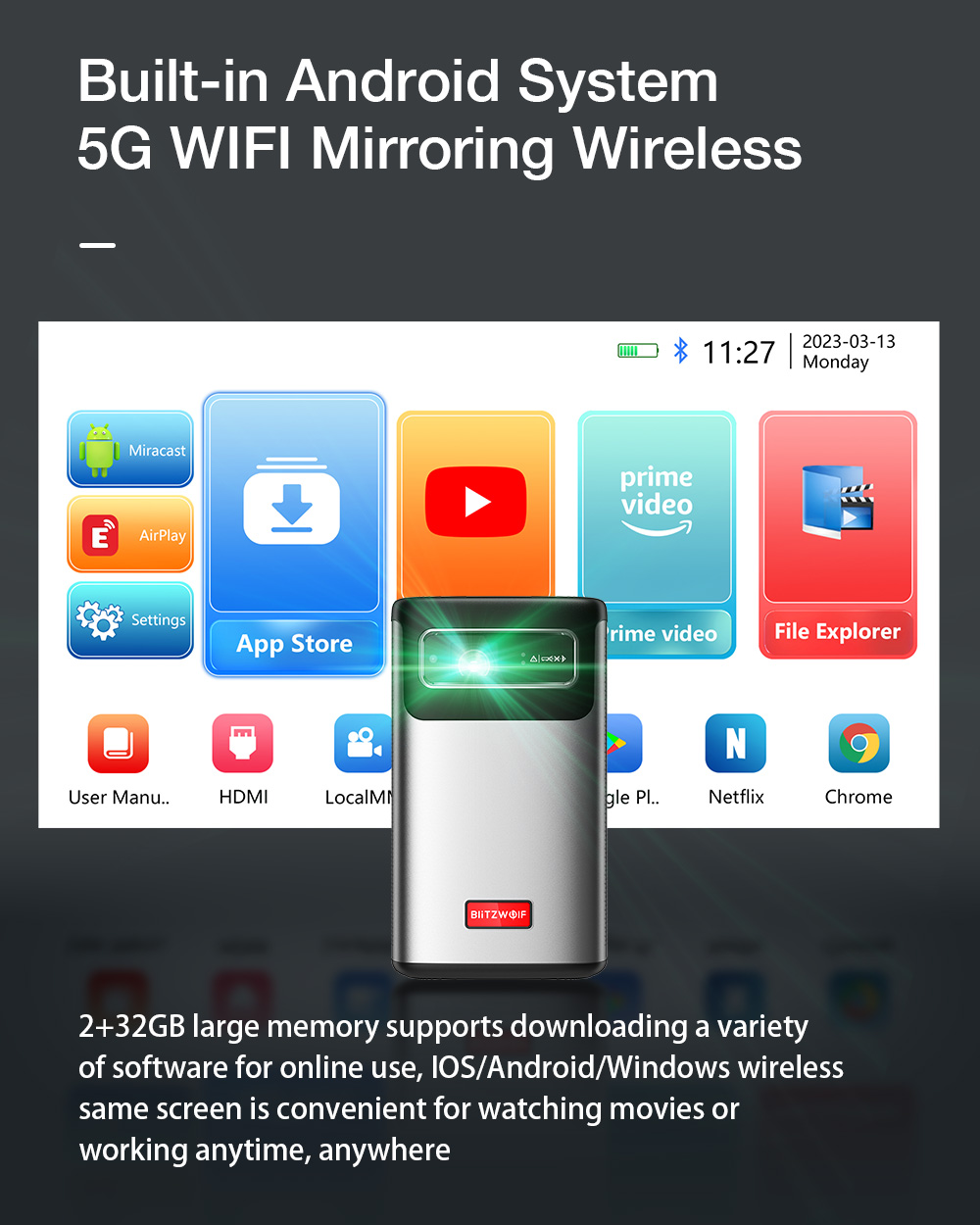 BlitzWolf BW-VT2 ProMax kannettava DLP-projektori Android-TV langaton Wi-Fi6 Bluetooth 5.0 8000mAh automaattitarkennus
