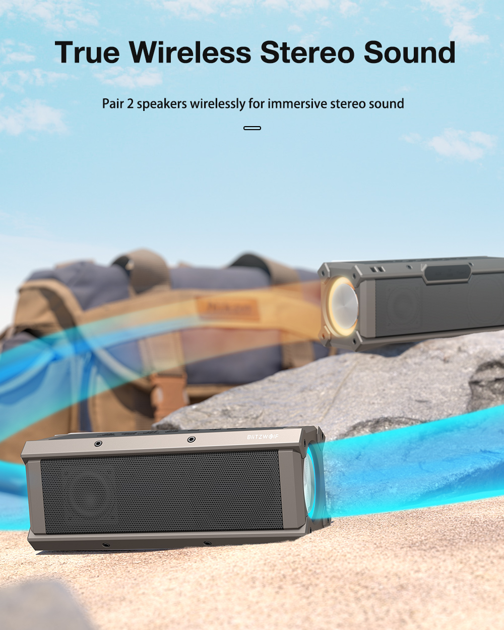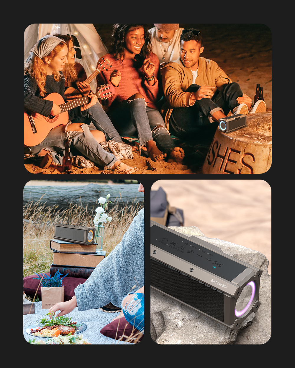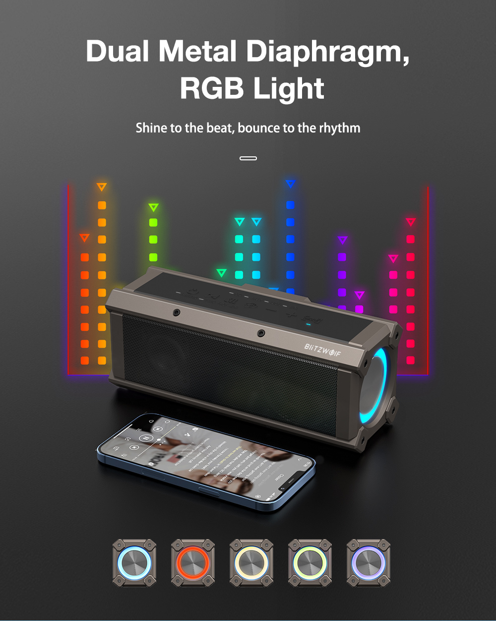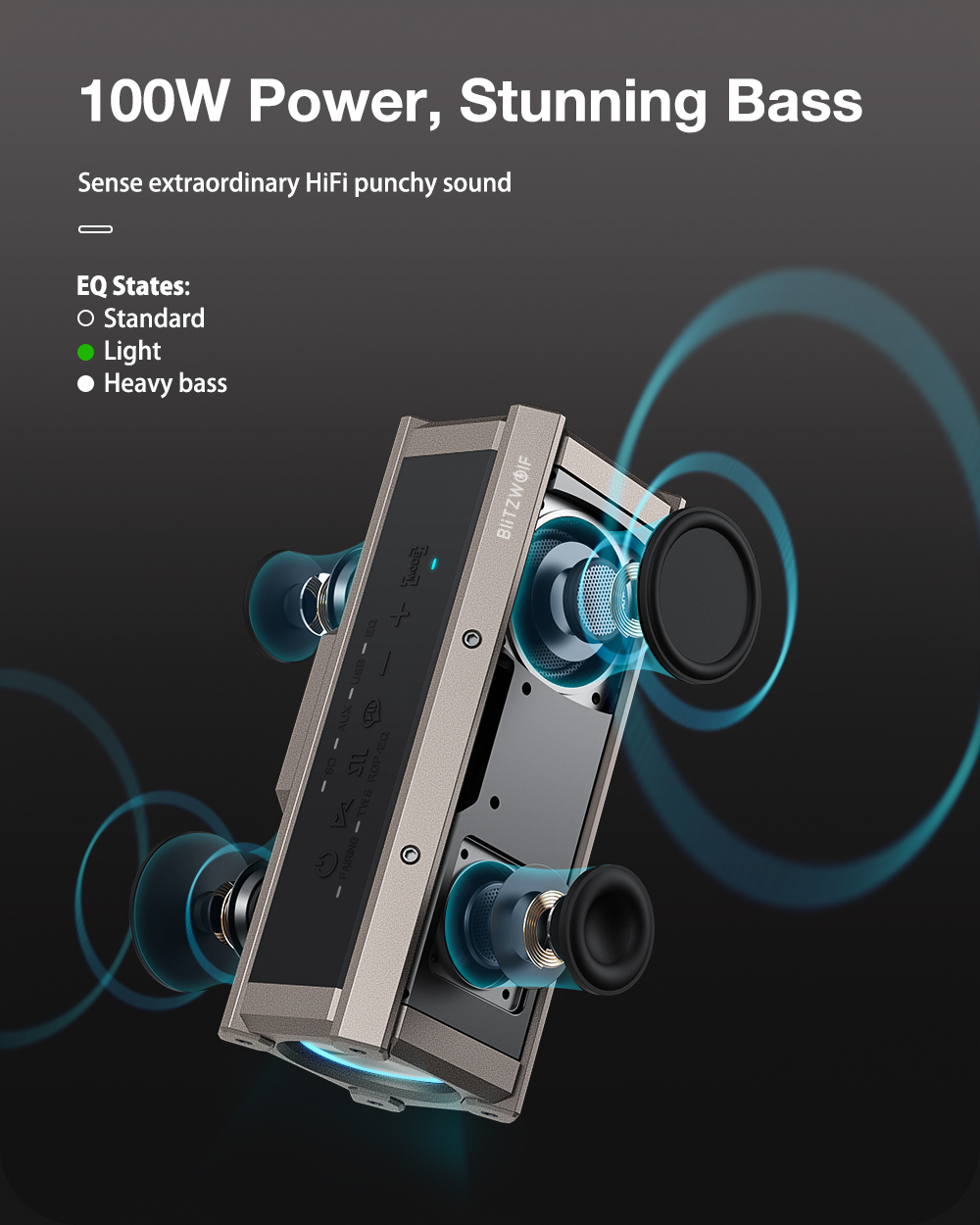 BlitzWolf® BW-WA3 on kannettava 100W Bluetooth-kaiutin, jossa on neljä elementtiä ja kaksi kalvoa, kolme EQ-tilaa, TWS-paritus sekä IPX5-roiskevesisuoja. Akun kapasiteetti 5000mAh mahdollistaa pitkän kuuntelun ja hätävaralatauksen USB:n kautta. RGB-valot tuovat musiikin tahtiin eloa juhliin ja iltoihin.