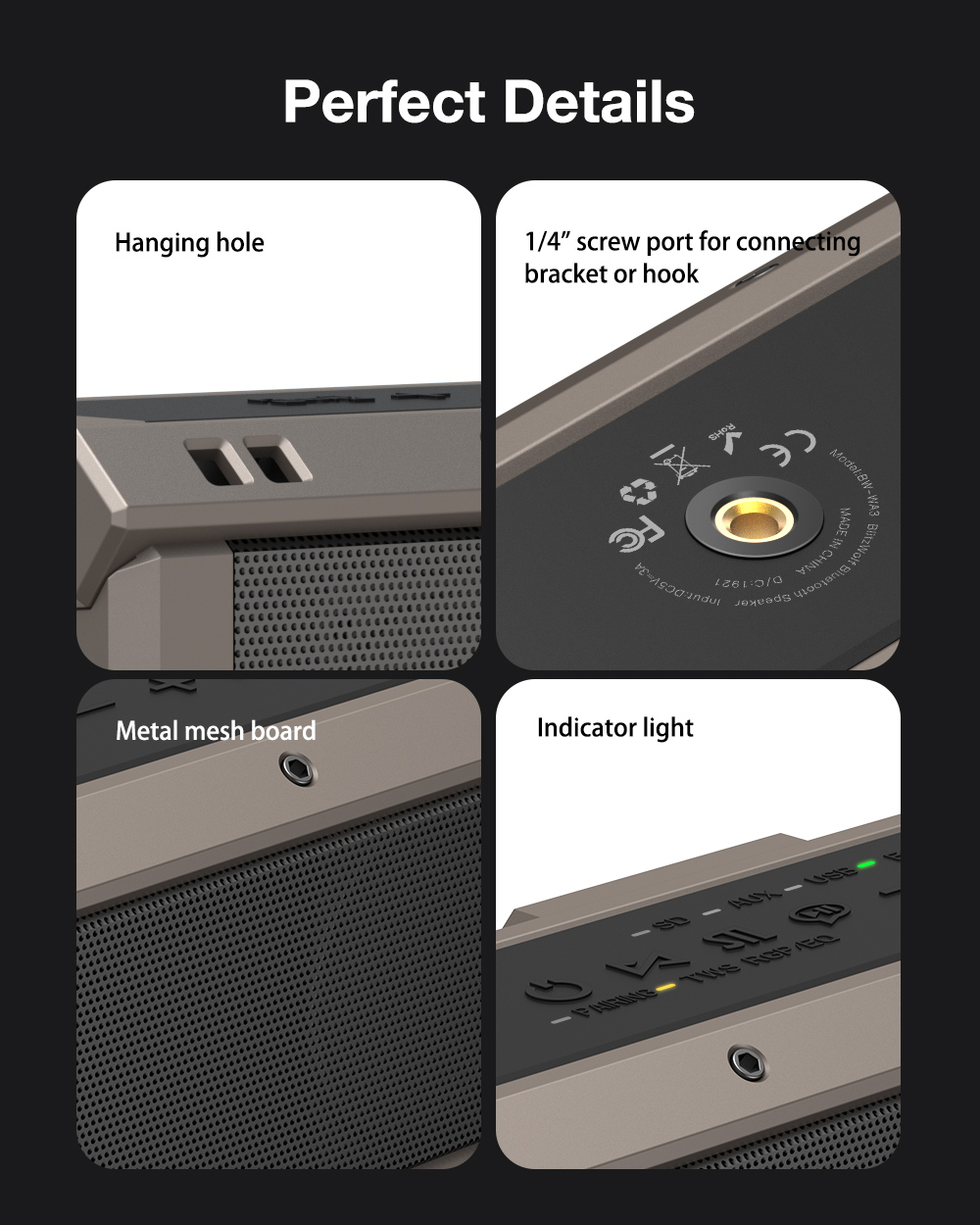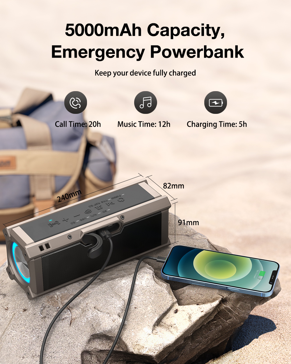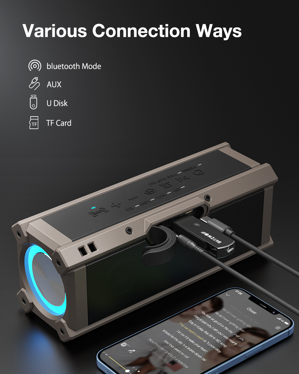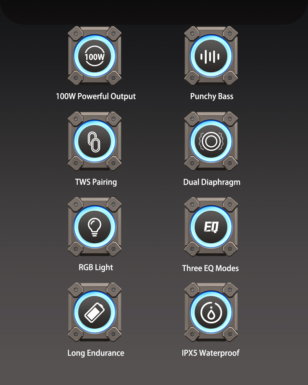 BlitzWolf® BW-WA3 on kannettava 100W Bluetooth-kaiutin, jossa on neljä elementtiä ja kaksi kalvoa, kolme EQ-tilaa, TWS-paritus sekä IPX5-roiskevesisuoja. Akun kapasiteetti 5000mAh mahdollistaa pitkän kuuntelun ja hätävaralatauksen USB:n kautta. RGB-valot tuovat musiikin tahtiin eloa juhliin ja iltoihin.