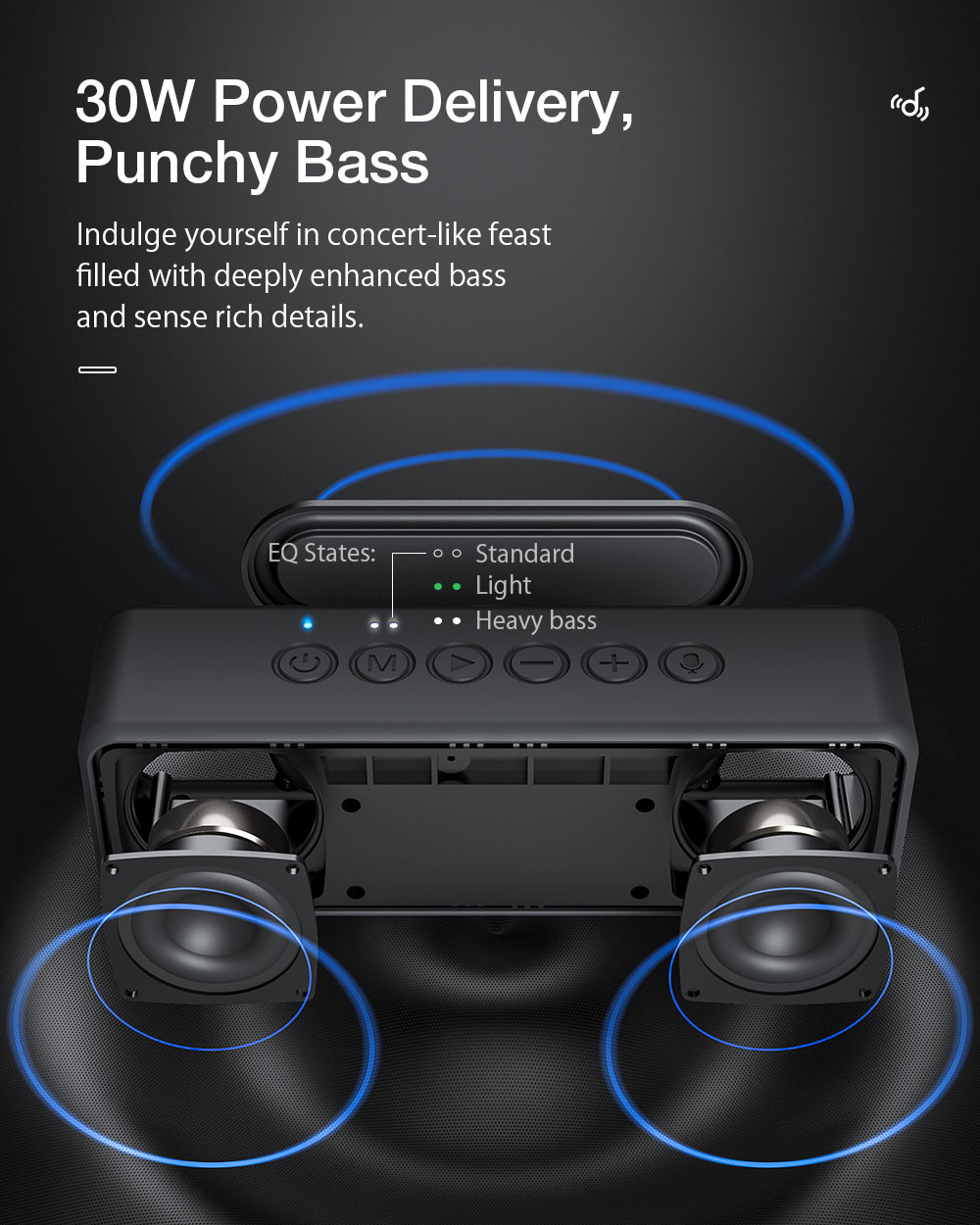 30W tehokas ulostulo, kaksoiselementit – Konserttimainen ääni syvällä bassolla ja yksityiskohtaisella äänikuvalla.