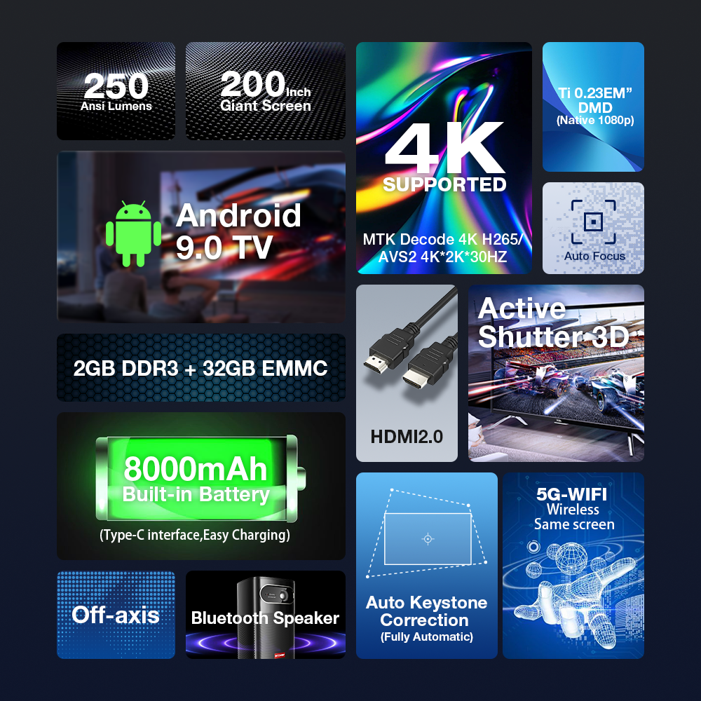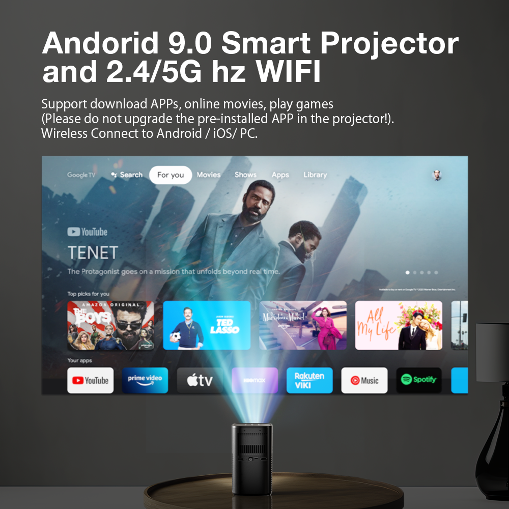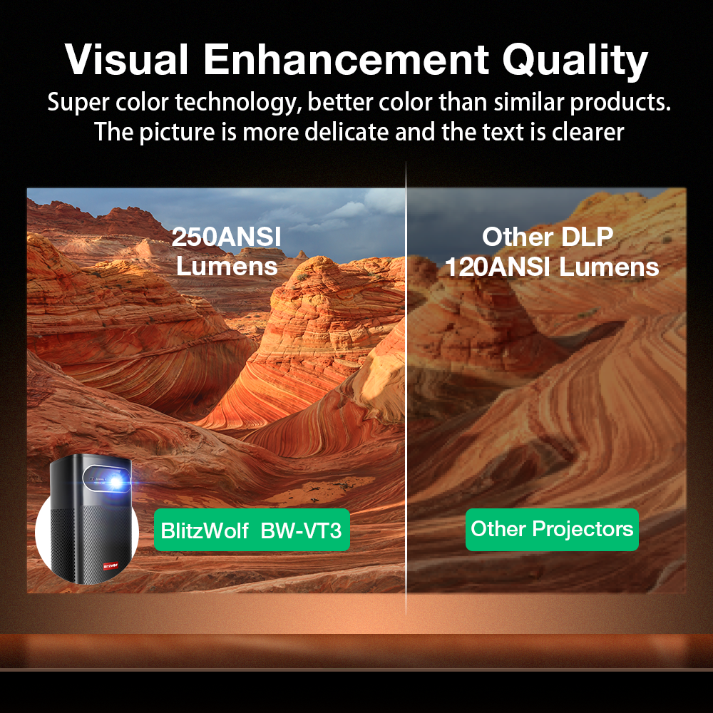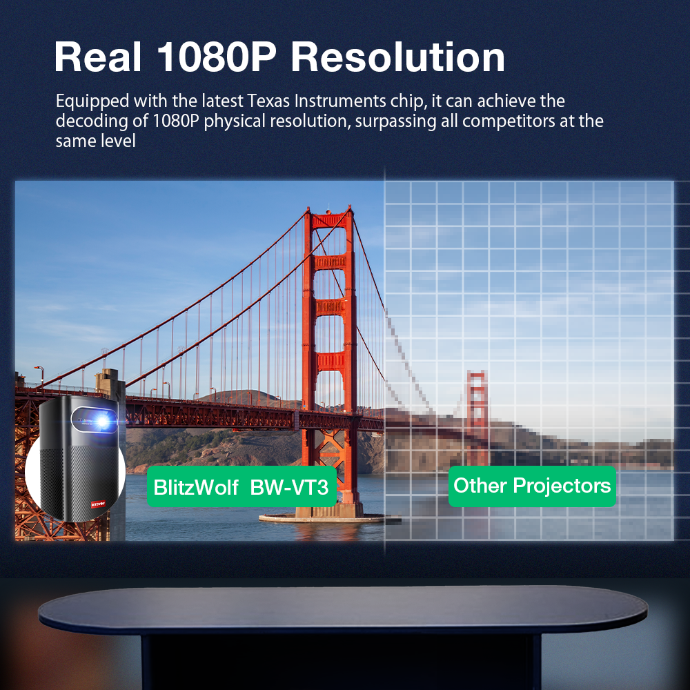 BlitzWolfBW-VT3 pieni kannettava projektori 1080P sisäinen akku 250 ANSI lumenia 4K tuki Android TV