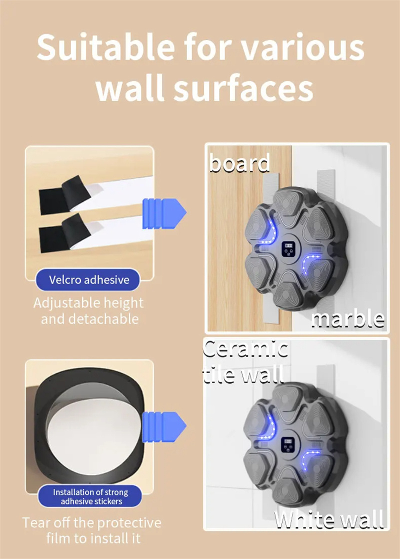 4. Helppo asentaa: Musiikillinen nyrkkeilyharjoituslaite voidaan asentaa helposti kiinnikkeillä tai kaksipuolisella teipillä, mikä tekee siitä kätevän seinään kiinnitettävän nyrkkeilykohteen. Kevyt rakenne helpottaa siirtämistä ja säilytystä. Laitteessa on hyvä palautuvuus ja iskunvaimennus, jotka auttavat suojaamaan käsiä harjoittelun aikana.