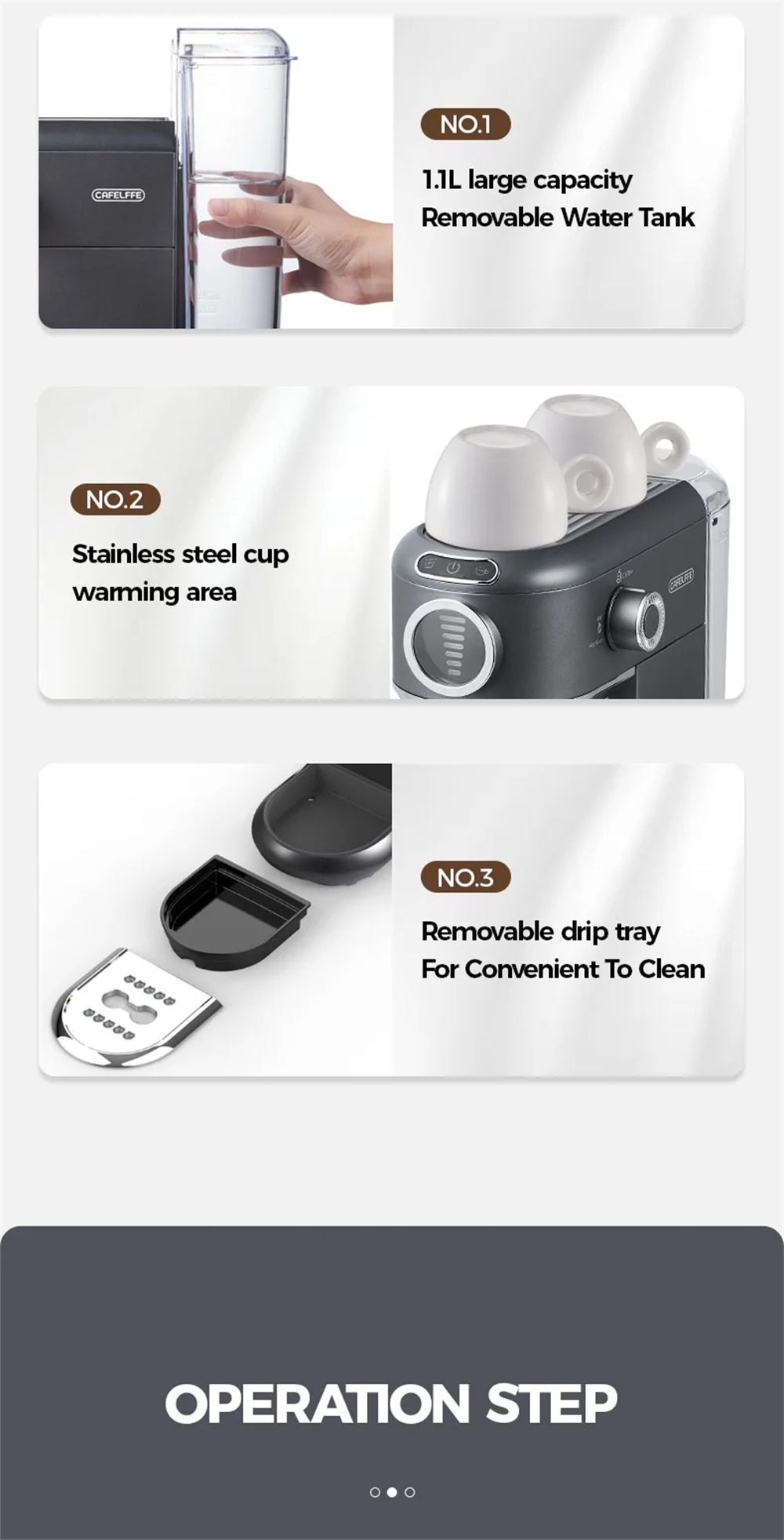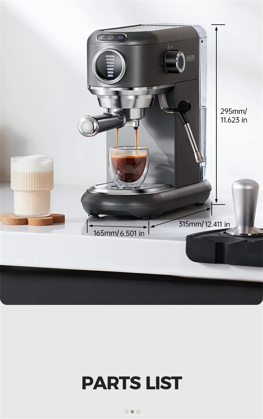 - Maitohöyrysuutin, kupinlämmitystaso ja kompakti muotoilu: 360° kääntyvä höyrysuutin luo samettisen mikrovaahdon latteen ja cappuccinoon. Ylätaso lämmittää kaksi kuppia, irrotettava tippakaukalo sopii myös korkeammille mukeille. Pienikokoinen runko (16.5 × 31.5 × 29.5 cm) ruostumattomalla teräspinnalla.