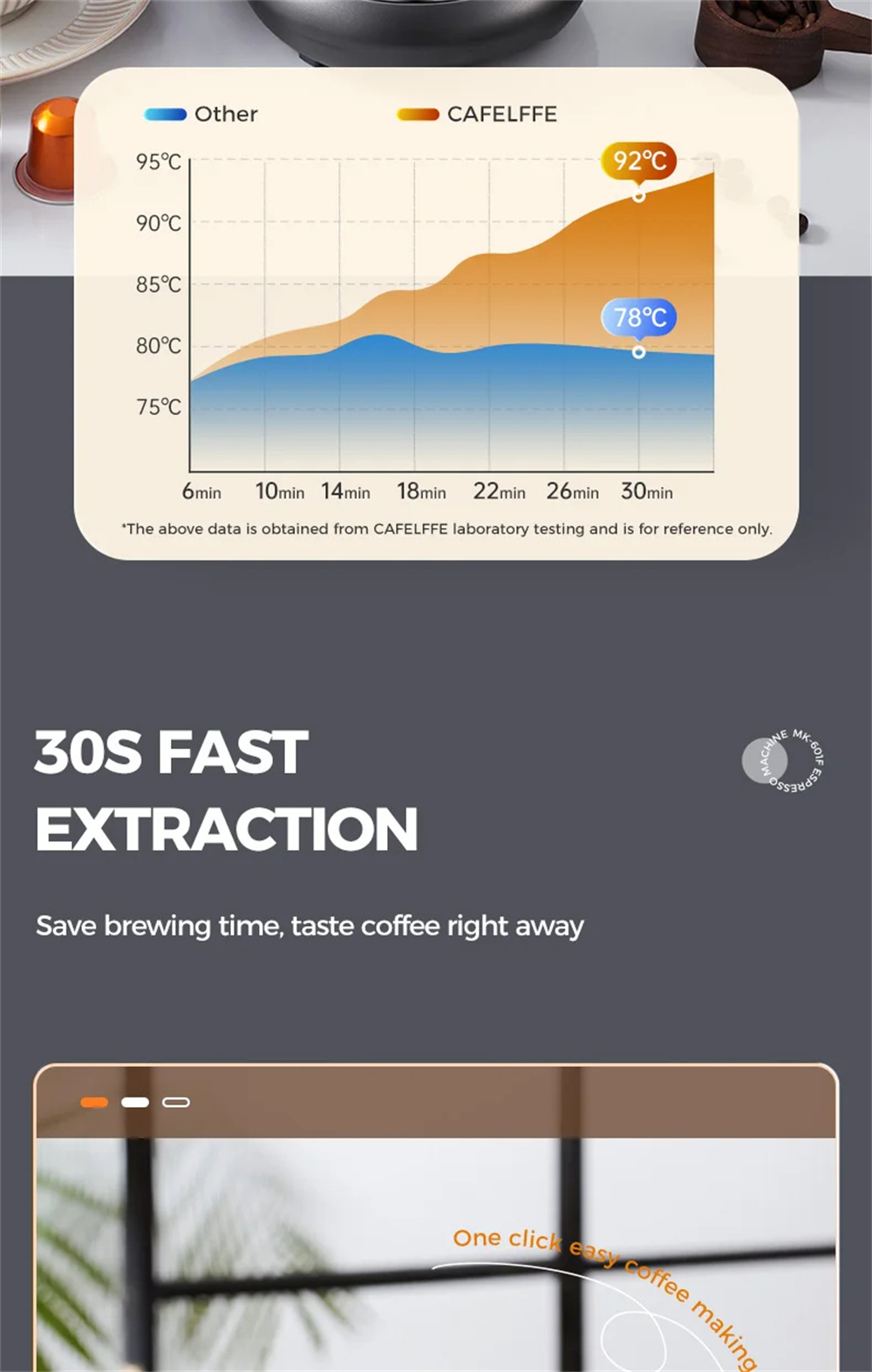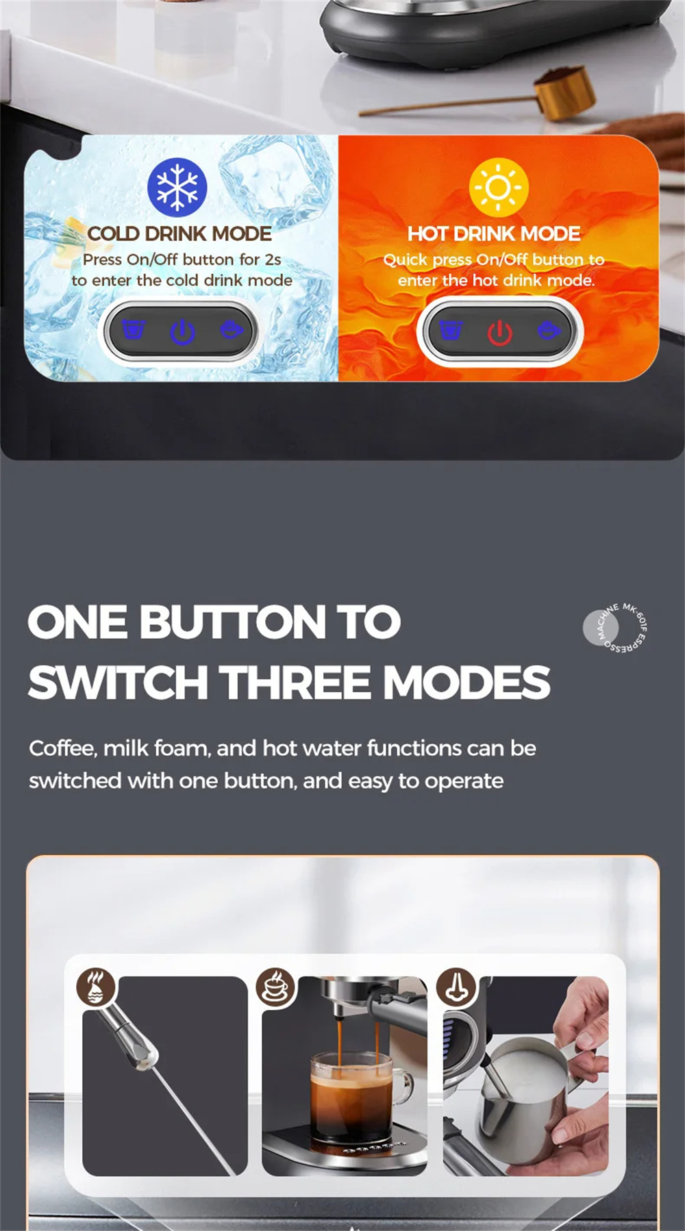 - Kuuma- ja kylmäkahvitilat: yhden painalluksen automaattinen uutto. Kuuma espresso noin minuutissa. Kylmäuuttotila käyttää huoneenlämpöistä vettä rauhalliseen uuttoon — tasapainoinen pohja virkistävään jääkahviin ympäri vuoden.