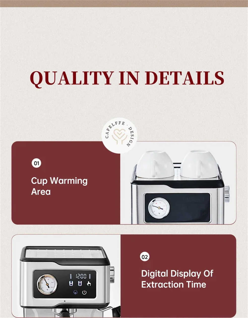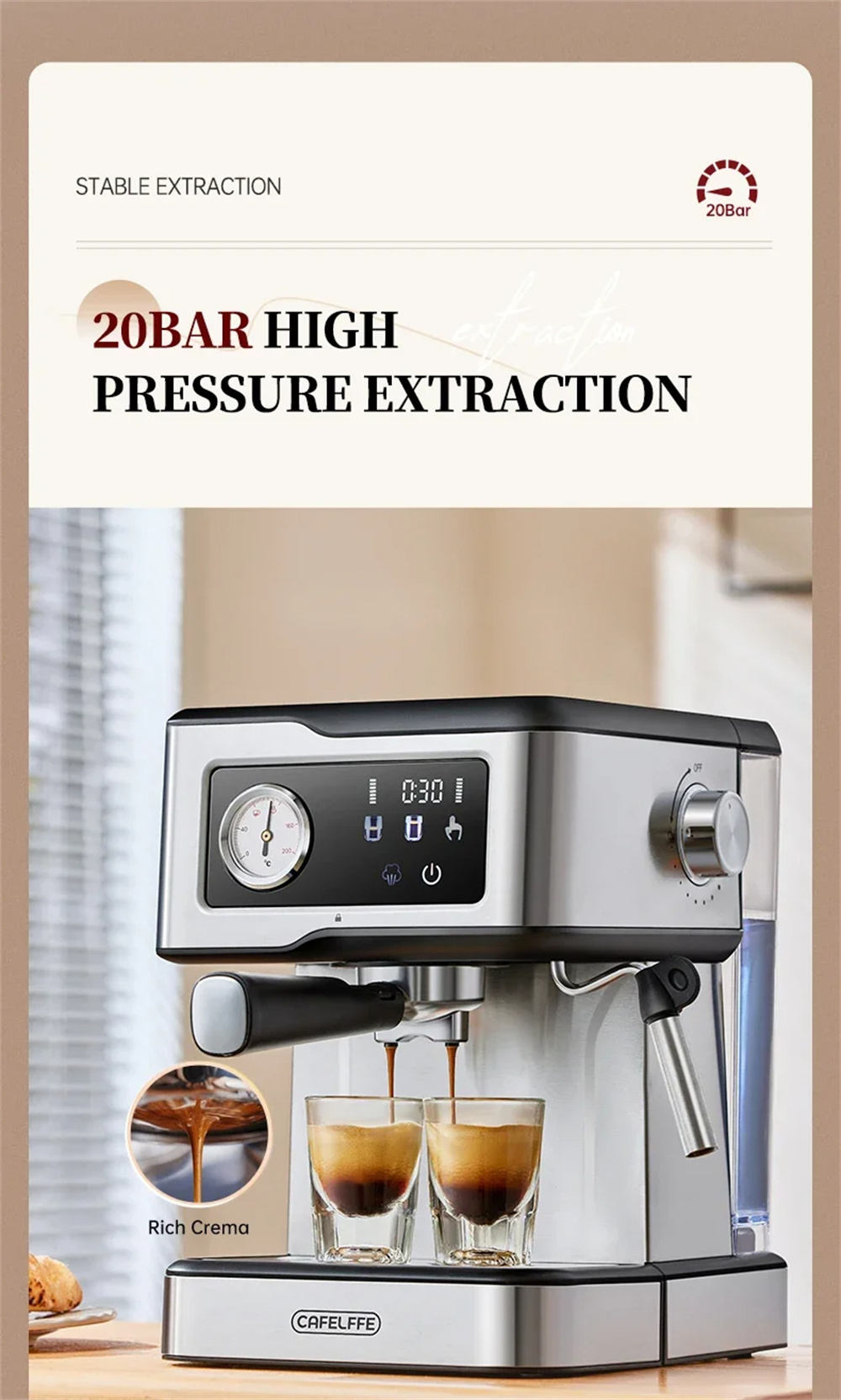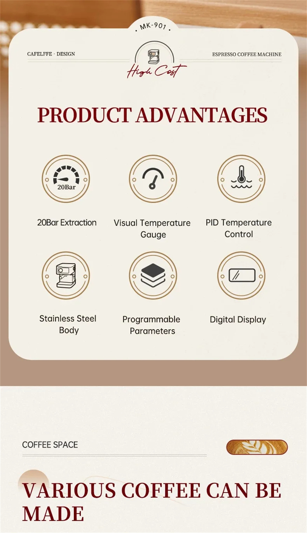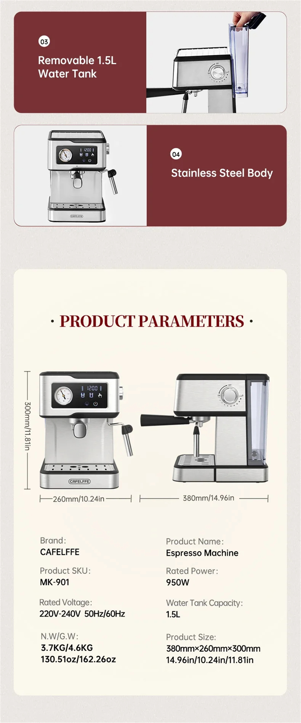 CAFELFFE MK-901 on kompakti espressokone kotikäyttöön. 20 barin paine ja 950 W lämmitysjärjestelmä auttavat uuttamaan täyteläisen espresson. Laitteessa on kosketusohjauspaneeli, höyrysuutin maidon vaahdottamiseen sekä säädettävä lämpötila omien mieltymysten mukaan. Irrotettava vesisäiliö ja tippakaukalo helpottavat puhdistusta.